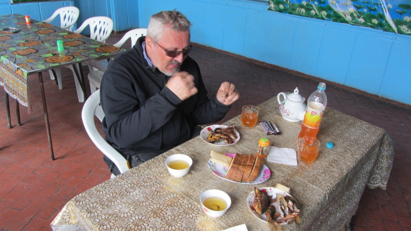 21.06.2015 - Heute war der Tag der Viertausender und des Einstiegs in das Bartang Tal. Doch zunächst gab es ein wirklich leckeres Frühstück in der Lodge, bevor bevor wir die Moppeds bestiegen. Unser Gastgeber hat sich dan noch riesig über unseren Aufkleber an seiner Pinnwand gefreut.