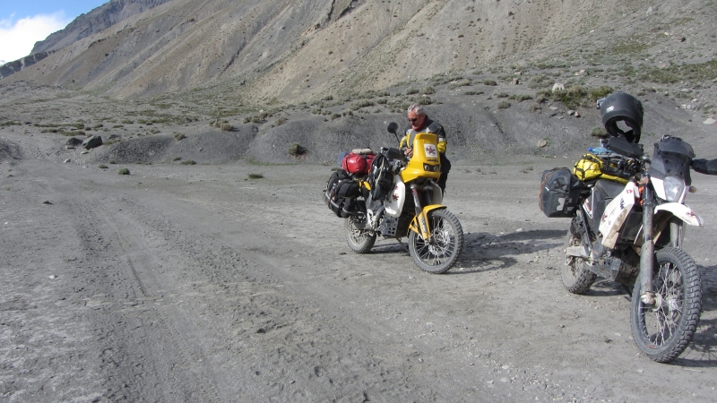 Naja, später haben wir diese Stelle nicht gefunden, weil es einfach zu viele solcher Stellen gab. Dann kamen so viele spektakuläre Streckenstücke, das man sie gar nicht alle beschreiben kann, man muss es selber erfahren haben im wahrsten Sinne des Wortes! Und dann kam der Pass, ein wirklich spektakuläres Stück Trasse, steil, enge Serpentinen, in denen Bäche zu queren waren, steile Anstiege wie ich sie noch nie erlebt habe, und es zog sich hin, die Fahrbahn oft nur 2 m breit, zur Hangseite abgeschrägt und dazu ein spektakulärer Blick über den Pamir und ins nachher ziemlich weit unten liegende Tal. Einfach atemberaubend, allerdings blieb nicht viel Zeit fürs gucken, der Weg musste im Auge behalten werden. Gut das wir relativ leichte und geländegängige Enduros haben, die sich oft nur im 1. Gang den Berg hinauf kämpften. Dann ging es hinab, der Abstieg schien endlos und ich hatte das Vergnügen, das Mopped noch einmal kontrolliert in einer Serpentine abzulegen, konnte aber diesmal mit eigener Kraft Mensch und Maschine aufrichten. Beschreiben läßt sich der Abstieg nicht wirklich mit Worten, auch steil ist hier relativ, ja, im Vergleich zum Abstieg war der Aufstieg weniger steil, gefühlt war der Aufstieg so um die 35-40° und der Abstieg um die 45°, wie gesagt, rein nach Gefühl. Auf jeden Fall bin ich vorher noch nie solche Steigungen gefahren!