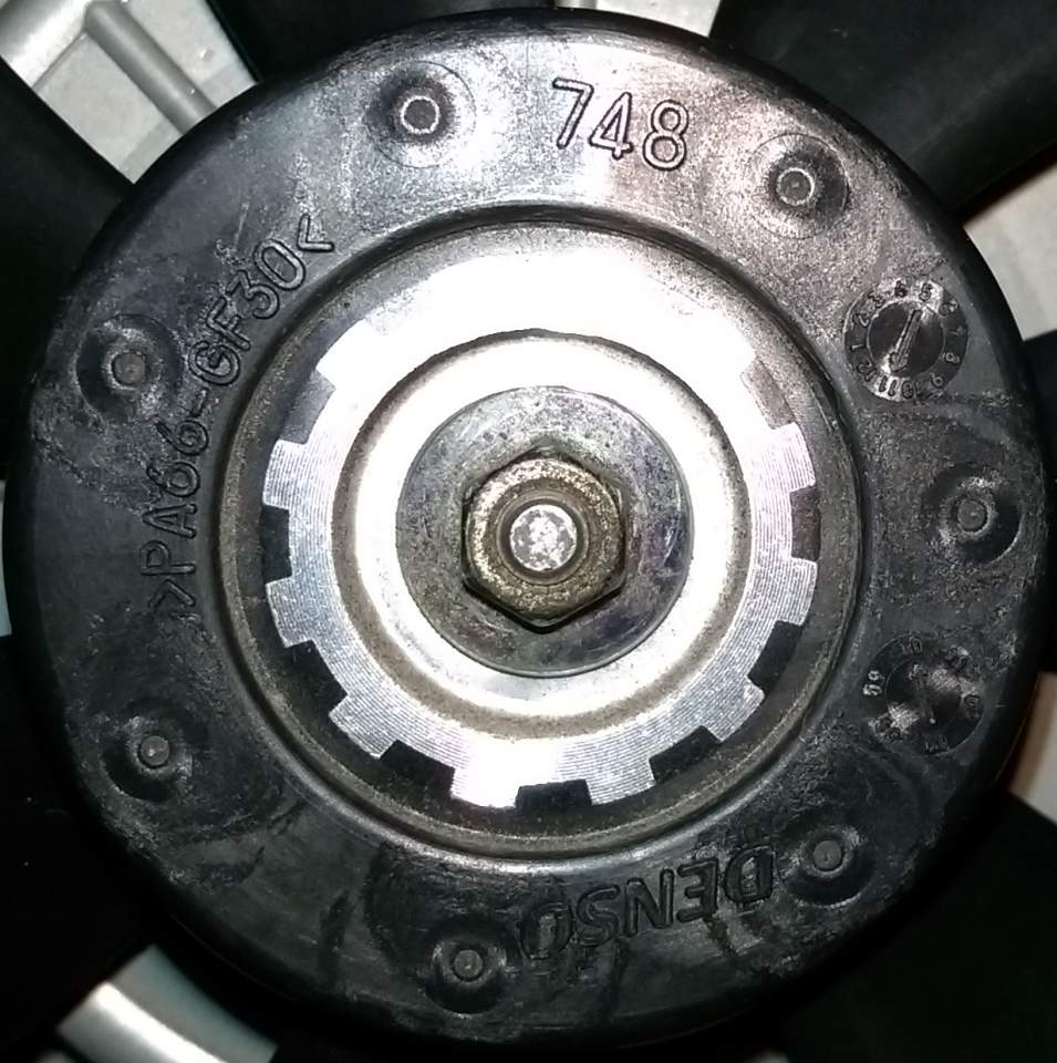 Lüfter Vorderseite mit Herstellerbezeichnung und div. anderen Aufschriften (Denso; >PA66-GF30<; 748)