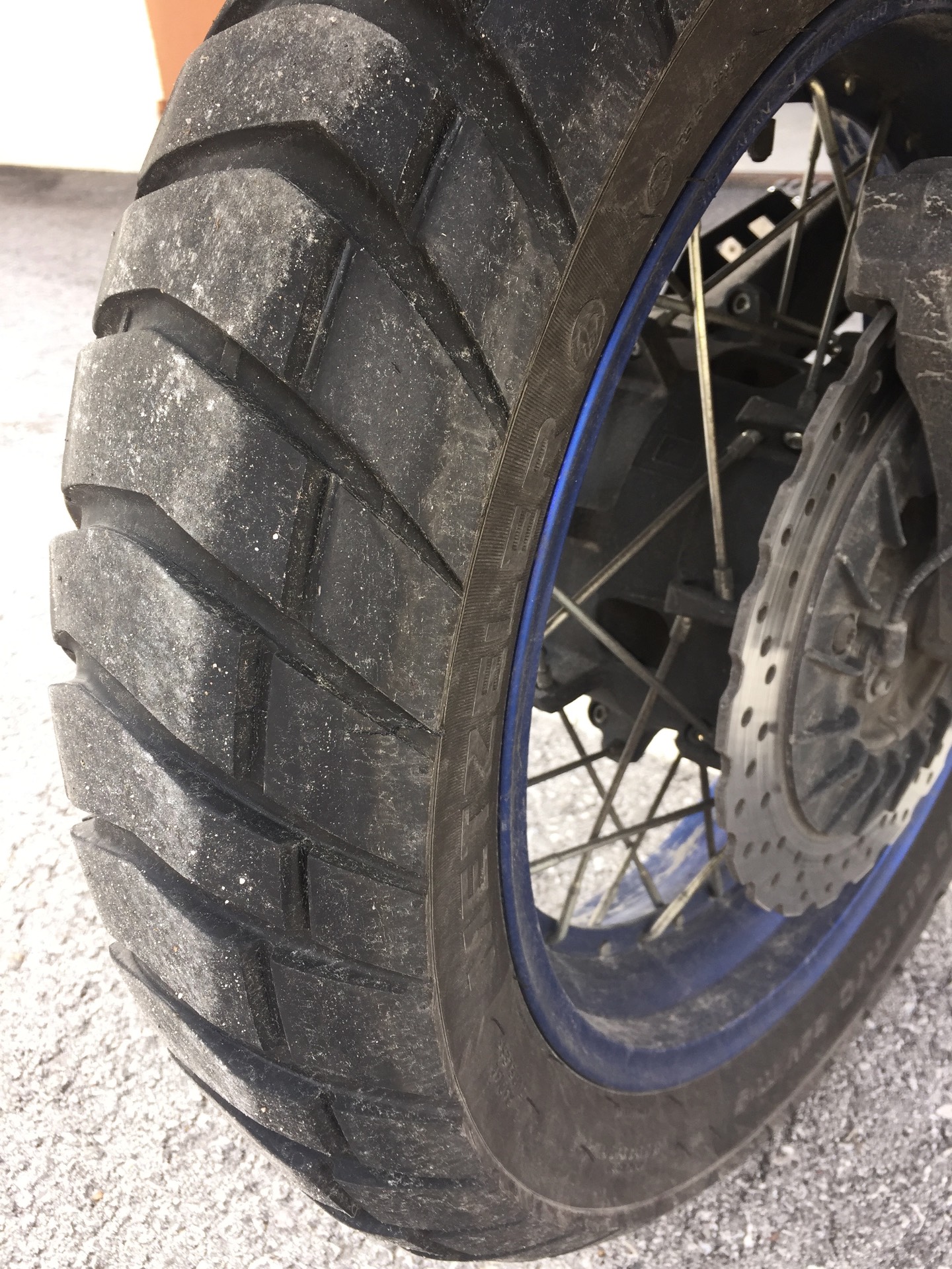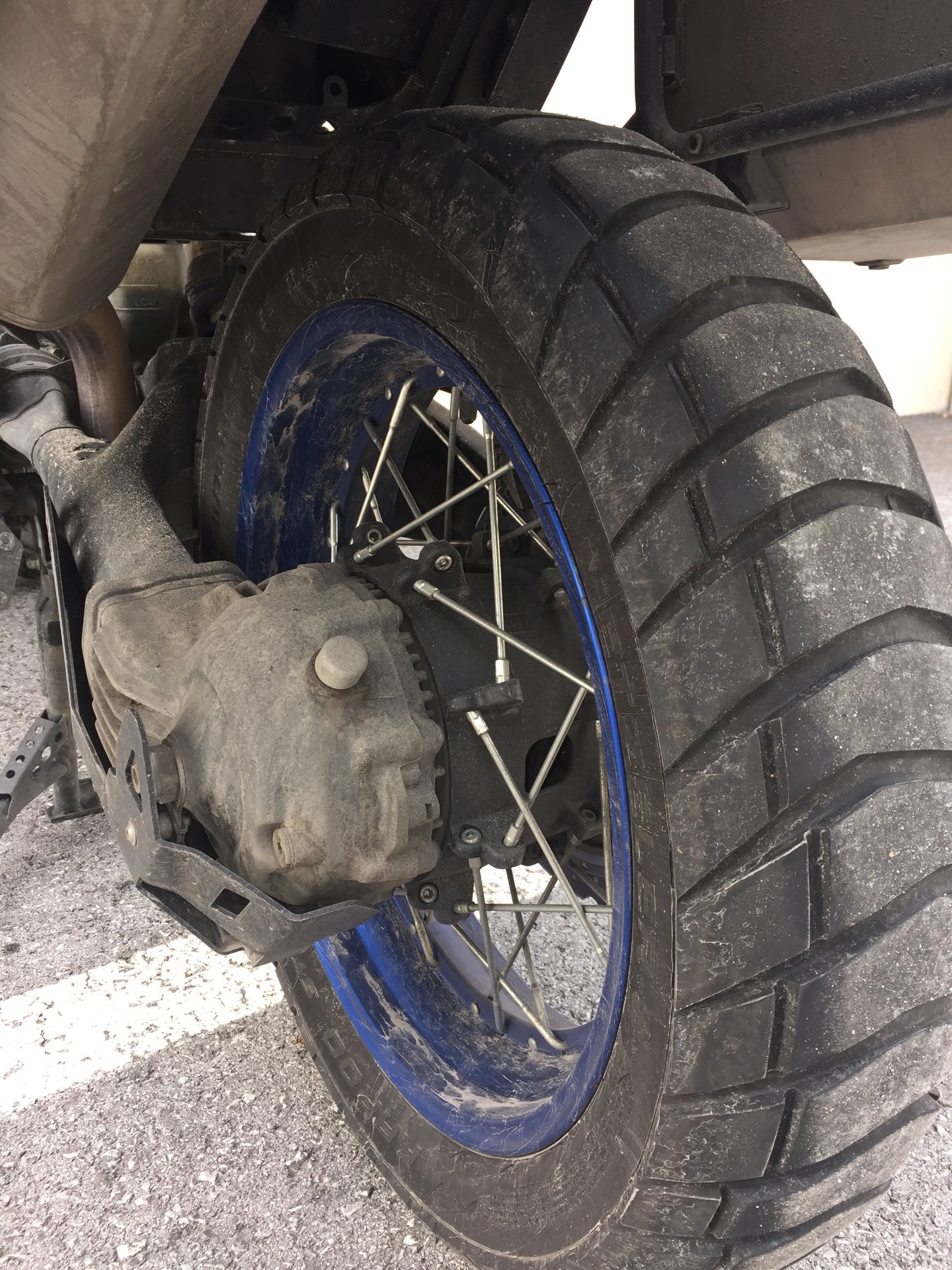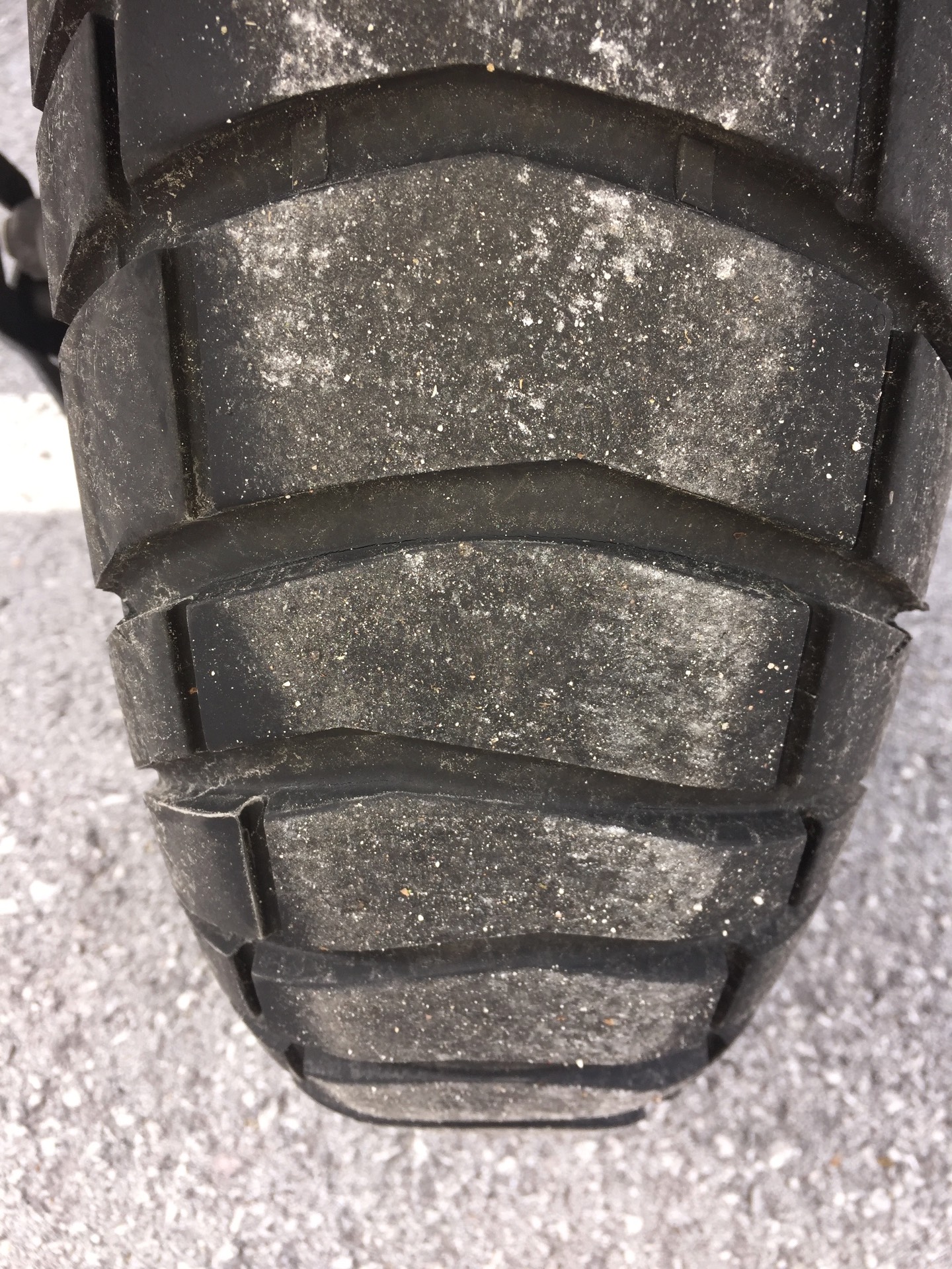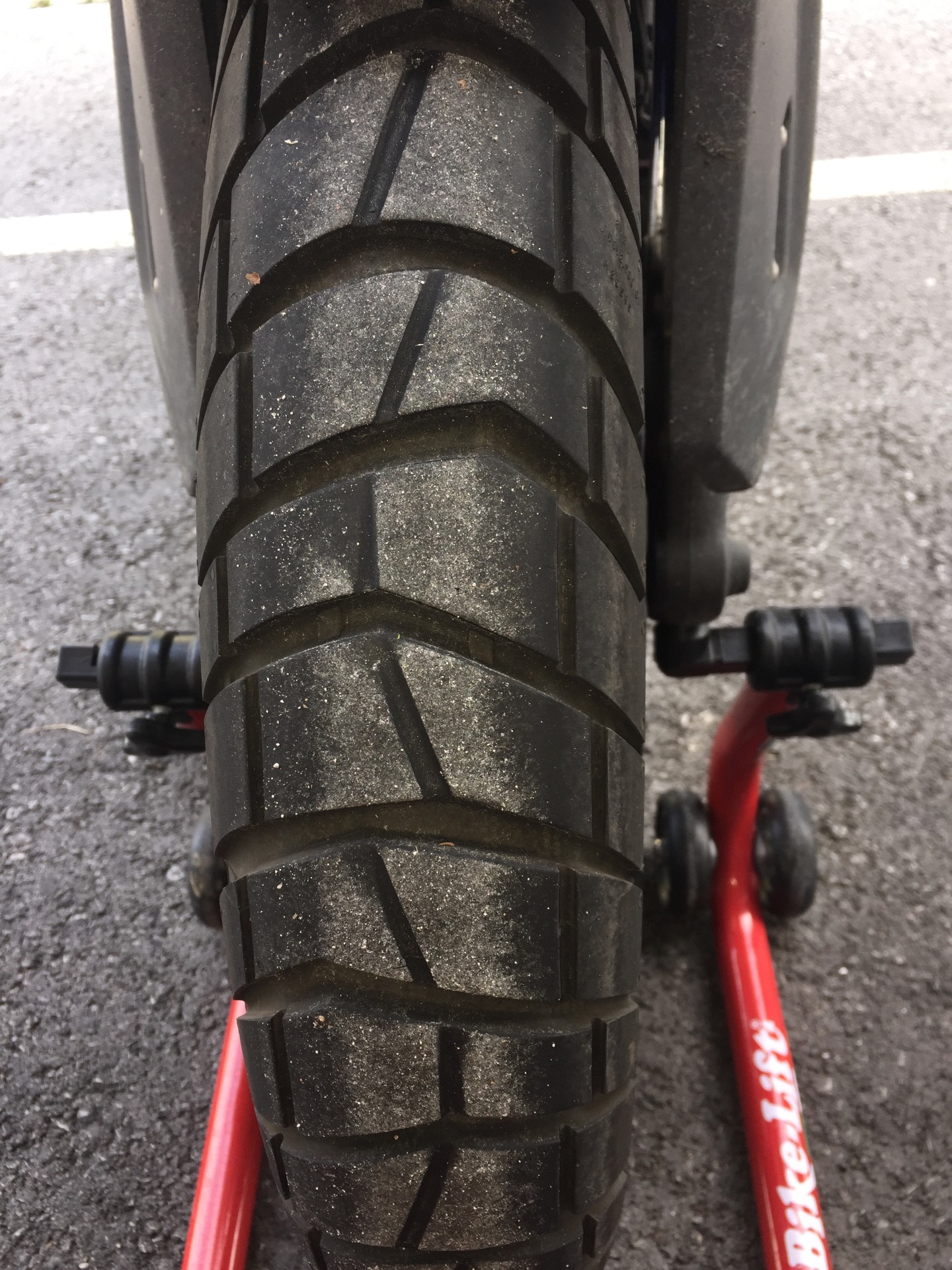 Zwischenzeitlich sah mein Hinterreifen aus wie ein Autoreifen. Ich hatte aber nie das Gefühl von Kippeligkeit. Wohl auch wegen der Beladung.