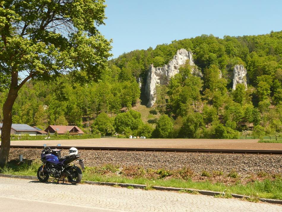 Das sonnendurchflutete Tal der Ach mit blauem Mopped unter blauem Himmel vor saftigem Grün und der Bahnlinie Ulm-Sigmaringen, das gefällt mir besser als Werkstattgerümpel.