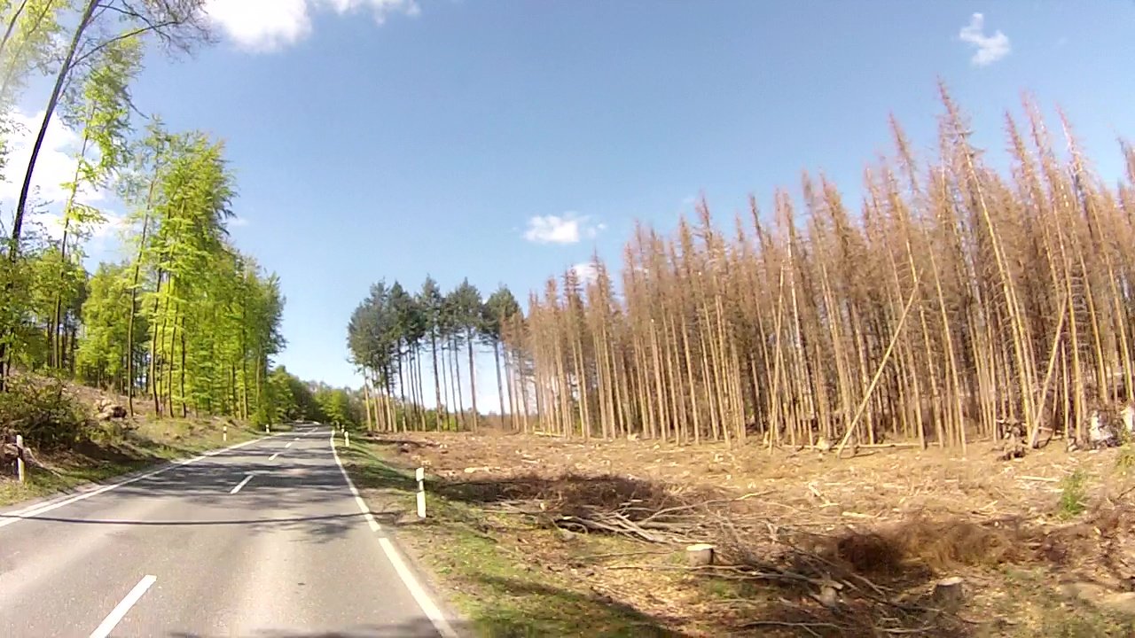 Im Sauerland. Hier bei Hirschberg wurde letztes Jahr schon gerodet. Man fuhr hier durch dichten Wald.Die Straße war 2 Monate gesperrt. Die Fichten wurden in Überseecontainer verladen.