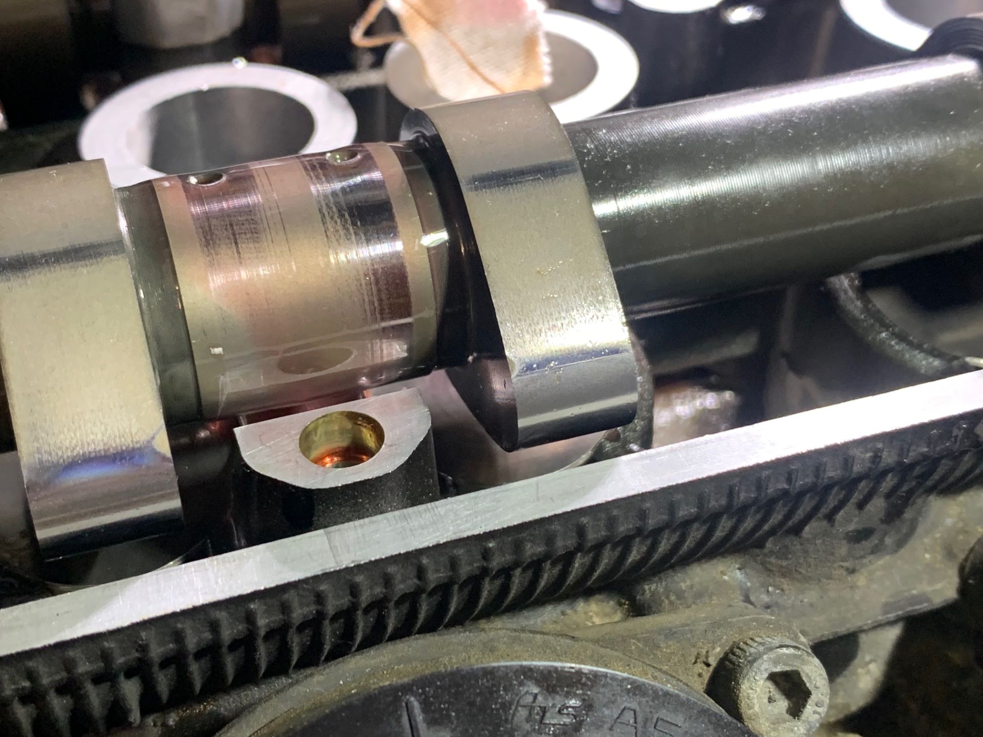 Erster Lagerbock drin und die Nockenwelle "schwebt" in der Luft.