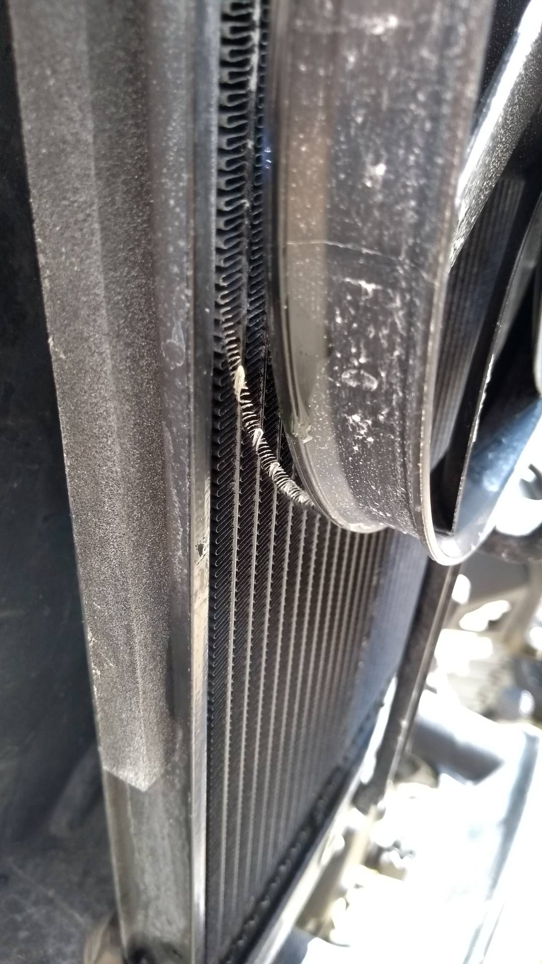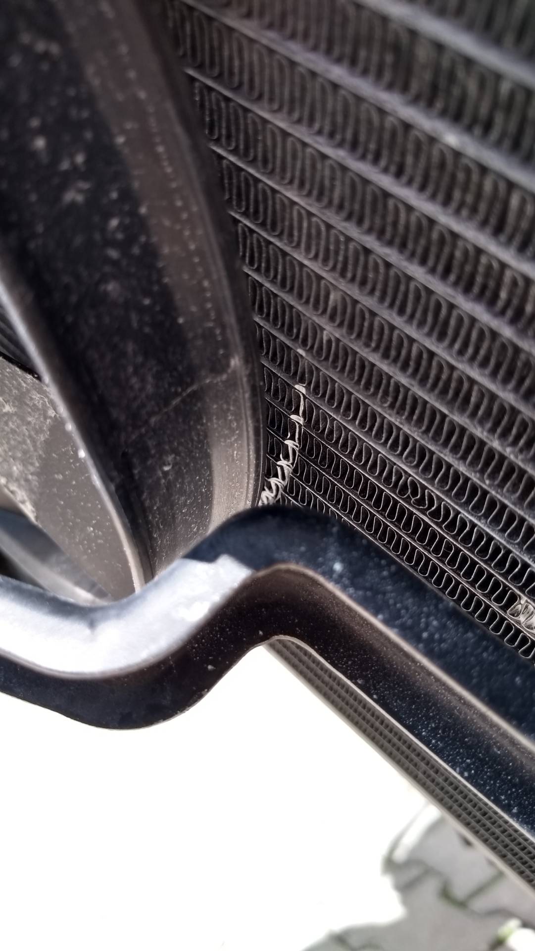 Es muss irgendwie mal einen starken Druck auf das Kühlergitter gegeben haben - von einem Umfaller auf diese Seite oder von einem Sturz weiß ich nichts, es ist auch nichts weiter zu sehen (das zerbrechliche Plastikgitter ist noch intakt, keine Kratzer etc...). Das kann irgendwann gewesen sein - durchgescheuert hat es den Kühler halt dann im Dauerbetrieb in dem Stau. Neuer Kühler ist jetzt bestellt und kommt hoffentlich nächste Woche.