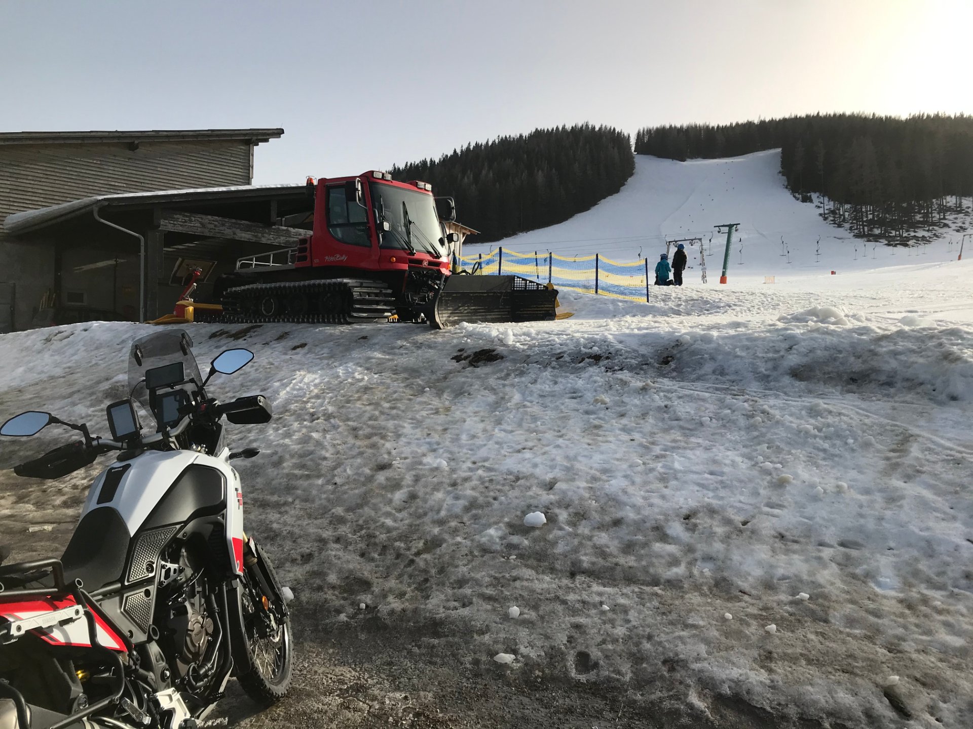 In diesem Fall bekam die kleine Tenere das Wechselkennzeichen umgehängt und die erste Ausfahrt führte in die Berge der Teichalm / Sommeralm wo ich bei ca 14°C auf bis zu 1600 Höhenmetern neben Schilangläufern und Schifahrern unterwegs war