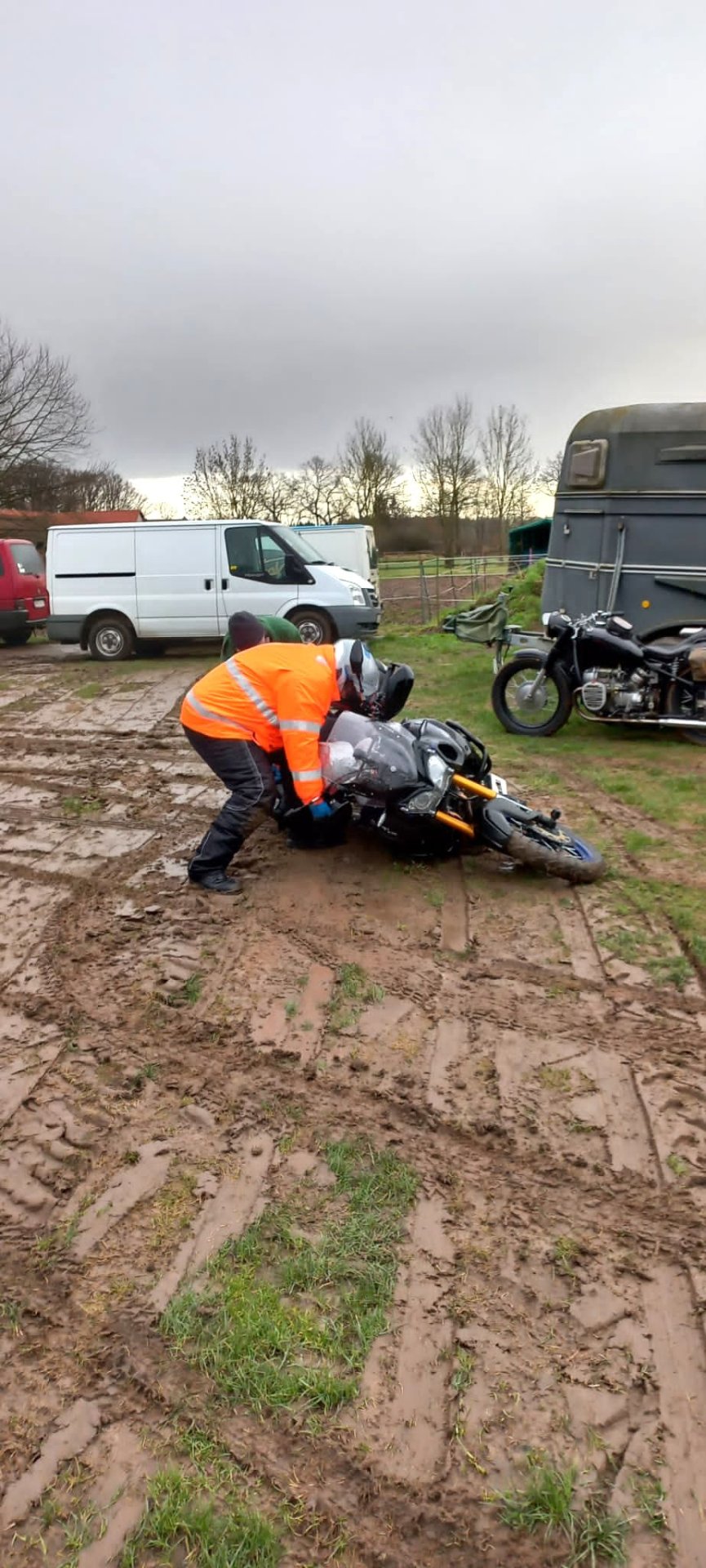 Alles heile....nur etwas dreckig an den typischen Stellen und ein paar Kratzer im Ego. Aber auf so ner Schmierseife haste halt einfach keine Chance das zu halten. Selbst beim Aufheben war der Grip an der Schuhsohle gleich null. Sah bestimmt lustig aus. Das war ein Gespann Treffen zwischen Hannover und Wolfsburg. Nach 2 Jahren C Scheiss musste ich mal wieder unter normale Menschen.