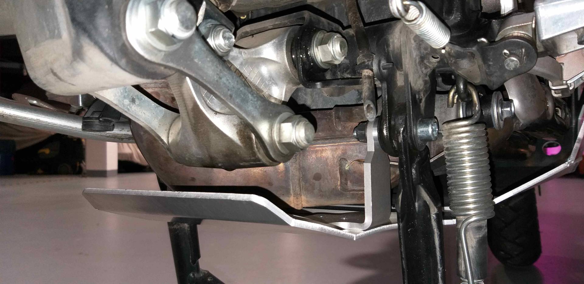 gestern war es soweit, musste ihn einfach anbauen. War schwerer als gedacht. Meine erste Hürde waren die originalen Schrauben vom Hauptständer. Diese werden entfernt und gegen Aluminiumhülsen getauscht. Ich habe natürlich auf der Federseite angefangen. Die Schraube rauszubekommen ist kein Problem. Die Hülse auf der Federseite passgenau wieder reinzubekommen schon. Habe schlußendlich die starke Feder ausgehangen, sonst hätte ich es nicht geschafft. Auf der linken Seite habe ich die Schraube nicht rausbekommen, weil sie am Auspuff nicht vorbeiging. Also noch Auspuff auf der rechten Seite (bei Fußraste) gelöst, dann ging sie raus. Die Hülse auf der Seite ging relativ smart rein. Dann das Teil anbauen. Da bin ich kurz vorm verzweifeln gewesen, vorne konnte ich schrauben, hinten hat immer ein halber Zentimeter gefehlt. Egal wie und wo ich davor gedrückt habe. Irgendwann habe ich dann dezente Gewalt angewendet und am Unterfahrschutz die hinteren Laschen nach hinten gebogen. Ist nicht ganz einfach, da die Laschen aus gutem Stahl sind. Nach ein paar Versuchen hat das dann auch geklappt, ich bezweifle aber, dass ich die Stahllaschen gebogen habe. Eher das untere Aluminiumteil. Danach konnte ich ihn mit Leichtigkeit anbauen. Das Teil wiegt übrigens 4,8kg, falls es jemanden interessiert.