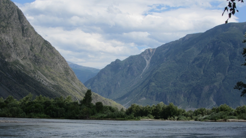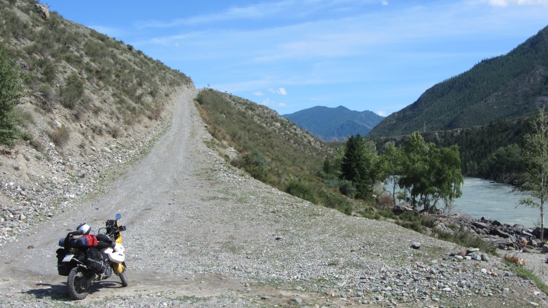 Eine weitere Ortschaft war schon deutlich kleiner und von hier aus ging die Piste in abenteuerlichen Windungen und Steigungen bzw. Gefällen über die Hügel und durch den Wald bis zum nächsten Pass, den es dann hinunter ging. Etwas mulmig war mir schon angesichts der sandigen Straßenoberfläche, weil die Bremse gerade bergab gefühlvoll gehandhabt werden will wegen der sehr sandigen Oberfläche. Mitten im Pass versuchten grade ein paar Bauarbeiter mit einer niedlichen kleinen Planierraupe die Straßenoberfläche glatt zu schieben. Sie ließen uns zwar durch, aber das war ein mittelschwerer Balanceakt, weil wir durch das aufgeschobene Geröll mussten. Und am Ende des Passes wartete die nächste Überraschung, die letzten Meter ging es verdammt steil bergab, im ersten Gang und leichter Stützbremse meisterten wir aber auch diese Passage. Uns kam im letzten Abschnitt noch ein SUV entgegen, der einen kleinen Pkw im Schlepp hatte. Die sind schon hart die Russen! Dann ging es weiter durch das Tal des Tschulischman Flusses bis zum Teletskoje See.