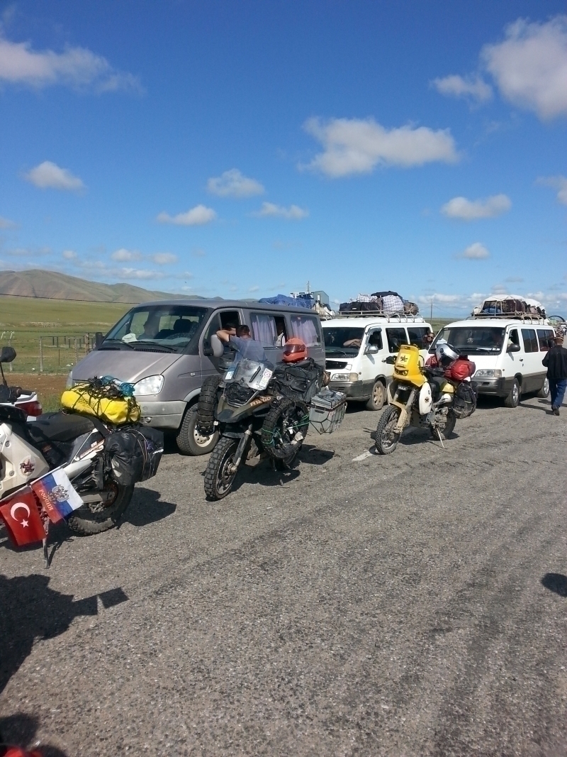 Was leider auch bedeutet, dass sich das ganze Prozedere endlos hinziehen kann. Schaun wir mal. Dann wird es spannend, immer wieder werden nach uns eintreffende Fahrzeuge von dem Posten oder teilweise vom Chef persönlich durchgewunken. Bei den Kleinbussen kann man das ja noch verstehen, aber bei den normalen PKW, die nahezu ausschließlich aus Kasachstan sind doch reichlich unverständlich. Wie wir nachher feststellen können, ist der größte Teil der Bevölkerung im Westen der Mongolei kasachischer Herkunft, insofern gibt es viele verwandtschaftliche Beziehungen und daher eben die „Sonderbehandlung“.