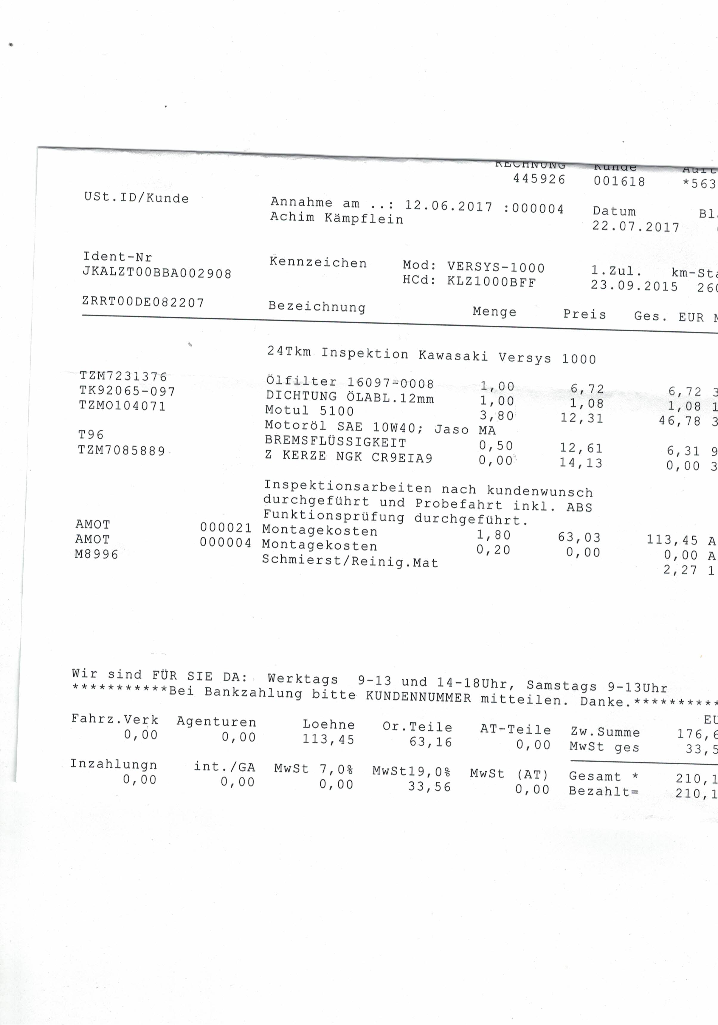 Für den "Inspektionsservice 20.000 km mit Ersetzen der Zündkerzen, Brems- und Kupplungsflüssigkeit und Antriebsöl" habe ich incl. MwSt. 262,36 Euro bezahlt.