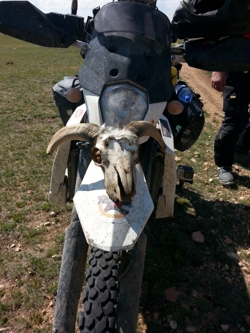 Dann schnell das Camp abgebaut und wieder rauf auf die Moppeds. Zurück zur Piste und dann weiter Richtung Tsagaanhairkhan zum Tanken und auffrischen der Wasservorräte und einem Snack sowie kalten Getränken. Bevor wir jedoch das Dorf erreichen treffen wir noch auf eine Art Denkmal an einem kleinen Pass, weil wi rneugierig sind wird angehalten und dabei gleich auch eine Pause für die notwendigen Bedürfnisse (Zigarette, Toilette etc.) eingelegt.