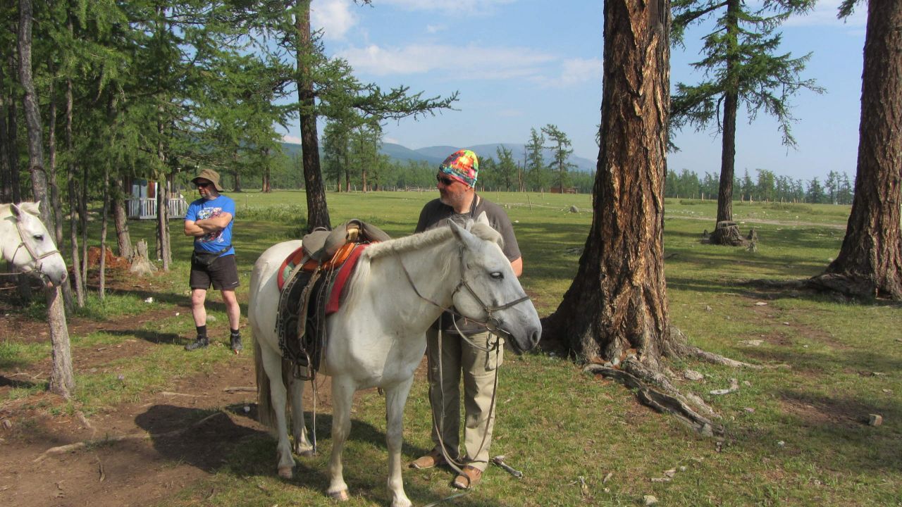 23. Juli. Da heute außer dem Ausritt nichts weiter anliegt schlafen wir bis neun Uhr. Nach dem Frühstück steht auch schon unser Führer mit den mongolischen Pferden vor der Tür, er im klassischen mongolischen Dress und wir im typischen Freizeitlook der Fernreisenden.