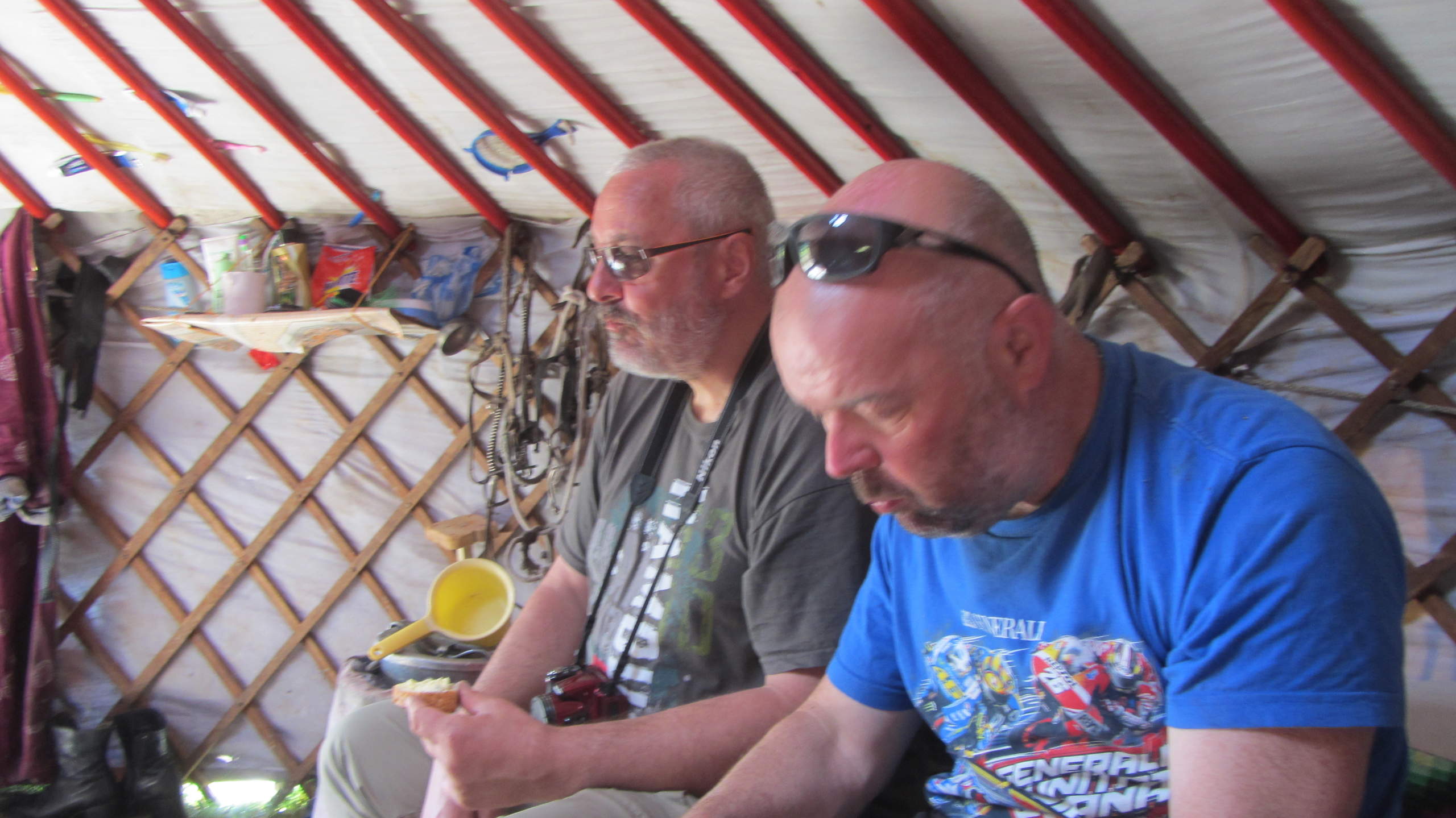 John hat das Manöver am besten gemeistert und darf zur Belohnung das Pferd selber steuern, während Thom und ich an die Leine genommen werden. Dann geht es los, ein bisschen durch den Wald und nach 10 Minuten wird erst einmal an einer Jurte gestoppt. Es handelt sich um den Wohnsitz unseres Guides, sein, sein Vater, seine Frau und die Kinder sitzen im Ger und blicken uns neugierig an. Wir werden zum „Frühstück“ eingeladen, als erstes gibt es Kumys, die gegorene Pferdemilch, nicht wirklich das wahre, aber Thom erbarmt sich, während John und ich jeweils nur einen Schluck nehmen.