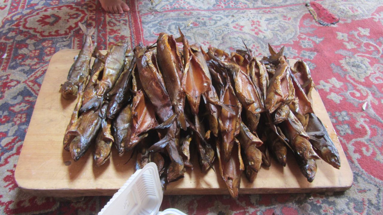 Danach wird uns geräucherter Fisch angeboten, wo ich dann dankend ablehne mit Hinweis auf Magenproblemen, was allgemeines Gelächter hervorruft. Doch dann wird selbst gebackenes Brot mit Butter gereicht, da greife ich dann auch zu. Danach sitzen wir wieder auf und werden weiter in den Wald in den Wald geführt, dort dürfen wir dann kurz zugucken, wie sein Mutter Fische ausnimmt, dazu das Schlauchboot bewundern, mit dem sie nachts auf den See hinaus fahren und wahrscheinlich wild fischen.