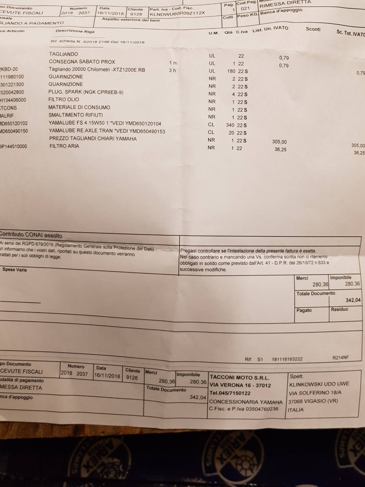 meine XT war jetzt auch in der 20.000er Inspektion. 668 Euro inklusive neue Reifen vorne und hinten. Metzeler Tourance Next, die von mir gewünschten Bridgestone A41 waren, zumindest der Hinterradreifen, nicht lieferbar, sagt der Händler. Von Bremsflüssigkeitswechsel oder neuem Luftfilter sagt die Rechnung nix. Neue Zündkerzen, Öl und Ölfilter und die Reifen, mehr ist auf der Rechnung nicht aufgeführt. Hinzu kommen noch zusätzlich zum Rechnungsbetrag neue Bremsbeläge hinten. Die hatte der Händler nicht da. Wurden bestellt und werden Samstag montiert. Aber neue Beläge hinten nach nur 20 tkm? Hatte ich noch nie bei einem Motorrad.