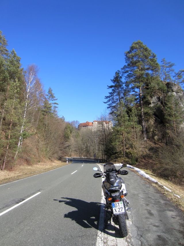 Unterwegs ein paar ungelenkige MTBiker, Schneereste am Strassenrand und Salzstaub auf den Brücken. Nach 20 km eine langgezogene Linkskurve bergauf, das erste mal wieder den Stiefel am Boden, die Motorradsaison 2012 ist eröffnet