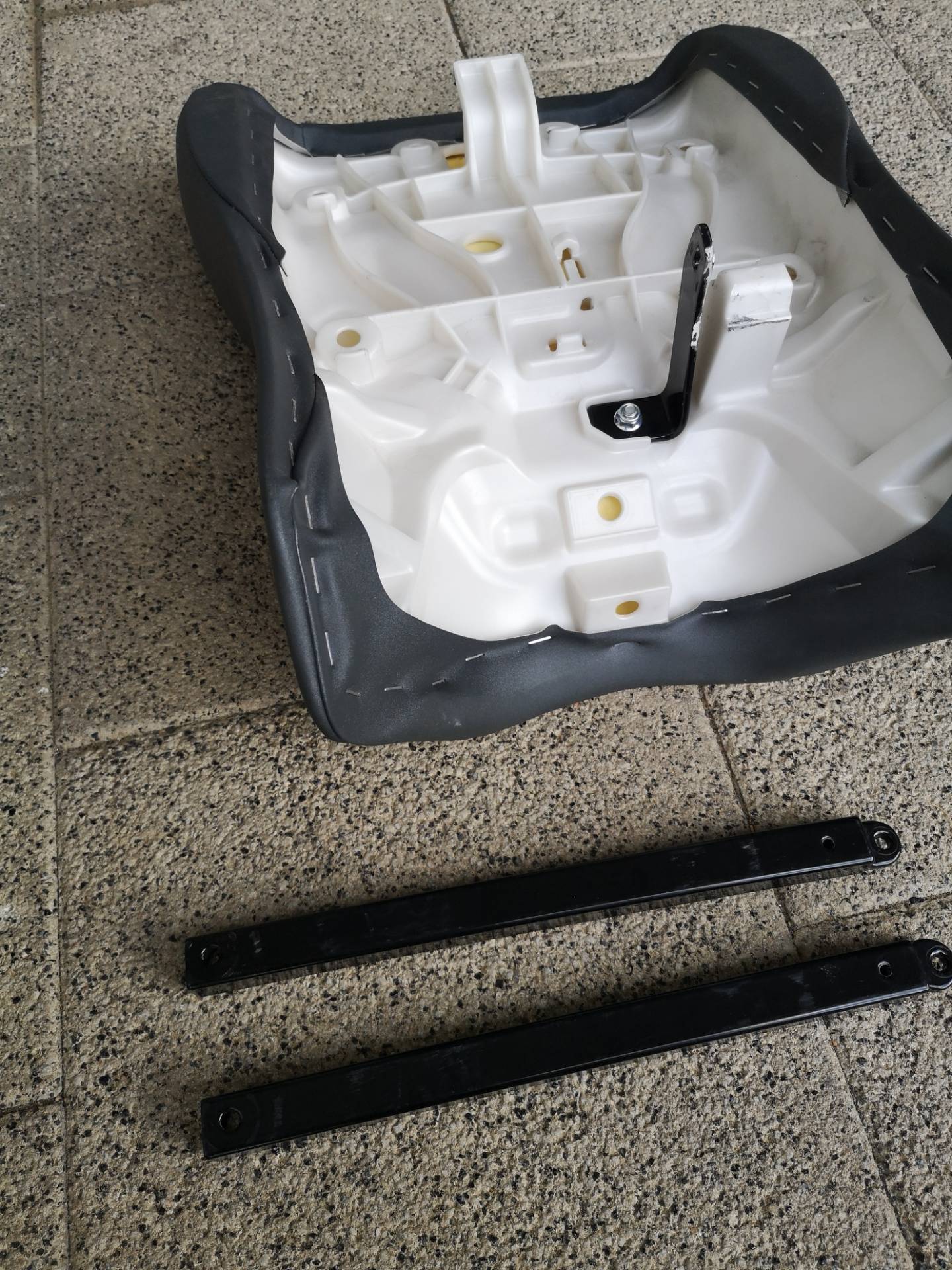 Ich würde mal raten, dass die beiden Streben jeweils (in Fahrtrichtung) quer unter die Sitzbank kommen und dort angeschlagen werden, wo normalerweise die Gummis sitzen. Damit liegt die Sitzbank dann wahrscheinlich mit den Streben auf der normalen Unterkonstruktion aus Kunststoff auf, die serienmäßig unterm Sitz eingestöpselt wird.