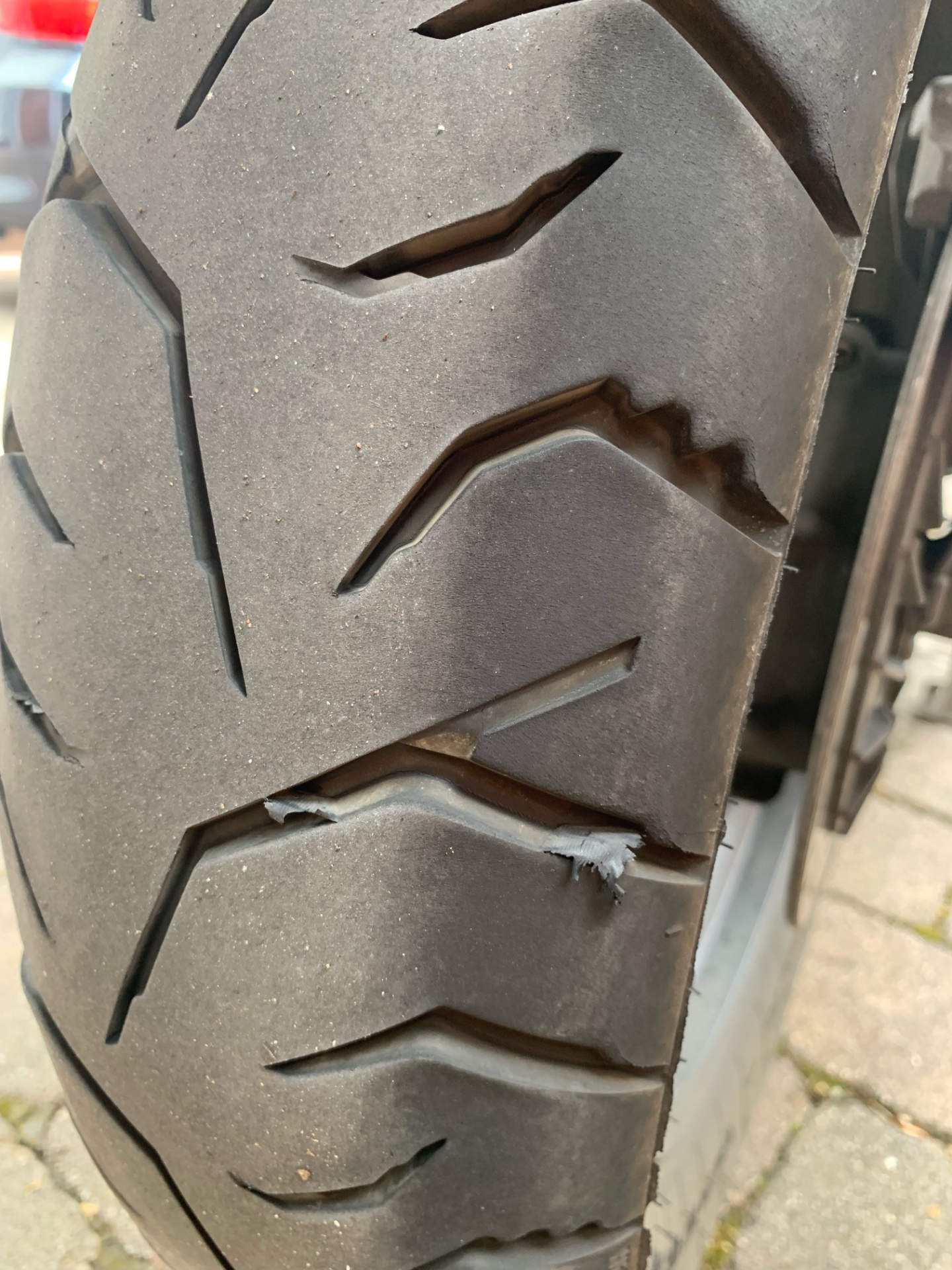 ...Seit 1.000km muss man ihn mit Kraft in die Kurve drücken. Das liegt vermutlich an der merkwürdigen Abnutzung der Reifen. Der Hinterreifen misst in der Mitte noch 1,4mm, an beiden Flanken aber noch 3,2mm. Der Vorderreifen hat in der Mitte noch 3,1mm, an der rechten Flanke (in Fahrtrichtung) aber nur noch 1,6mm. Die linke Flanke hat noch 2,1mm. Ich hatte noch nie einen Vorderreifen, der nur an einer Flanke abgefahren war.