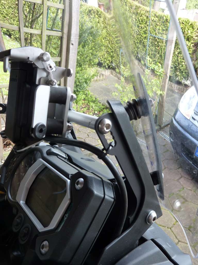 Unten kann man die originale Länge lassen, oben wurden etwa 1 cm längere Schrauben verwendet. Durch die Gummiaufnahmen sind diese etwas flexibel. Zwischen Scheibe und Gummiaufnahme wurden jeweils 1 Gummischeibe (dick) und zwei Unterlegscheiben eingesetzt. Dadurch hat man an der oberen Aufnahme etwa einen Abstand von 1 cm. Hört sich wenig an, bringt aber viel. Dadurch steht die Scheibe um einiges steiler und die Abrisskante leitet den Wind jetzt über den Helm.