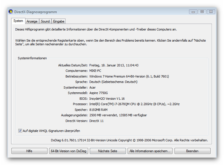 Mit Start --> Ausführen --> dxdiag kommst du zum enstrechenden Dialog...