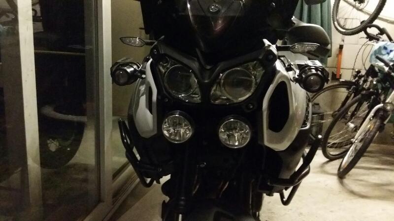 Abhilfe habe ich durch die Hawk von sw-motech geschaffen, die sind ziemlich unten am sw-Sturzbügel montiert und sorgen für ordentliche Ausleuchtung. Diesen Winter hab' in die Hawk ebenfalls NightRacer eingesetzt, eine Funktionsprobe in der dunklen Garage macht Vorfreude auf den ersten "echten" Einsatz während einer Nachtfahrt.
