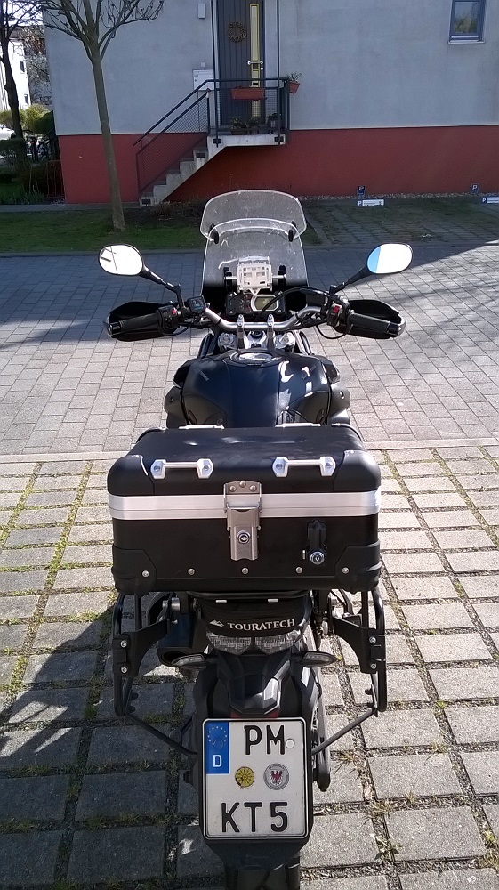 Grundsätzlich mögen wir eigentlich keine Topcase, da die für uns immer zu groß und klobig waren und wir die irgendwie optisch nicht so toll fanden. Da ich aber bereits einen Träger von Touratech montiert hatte und ich wusste, dass es dort ein kleineres Case gibt, fiel unsere Wahl auf diese Variante.