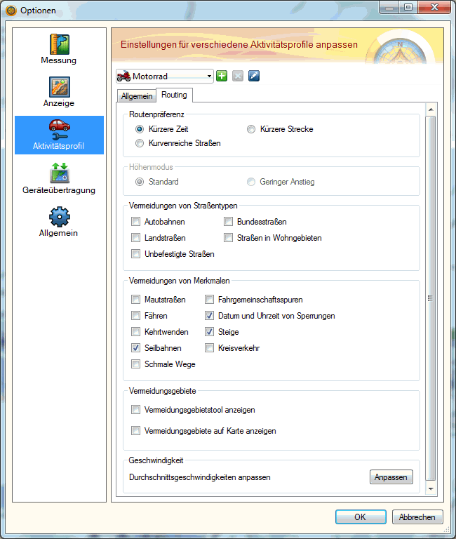 Das Wichtigste bei Basecamp ist, dass man das Aktivitätsprofil Motorrad richtig einstellt.