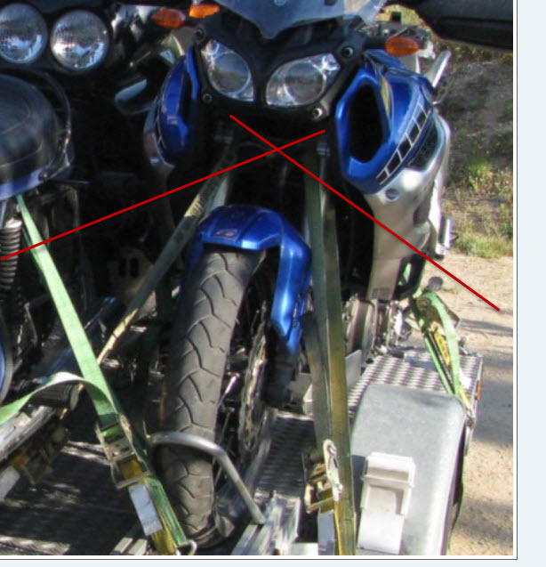 Und mit normalen Ratschengurten um die untere Gabelbrücke wird auch schwierig, da die Verkleidungen links und rechts weit überhängen.