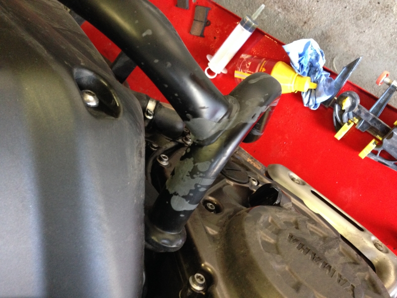Dann tropfte plötzlich was. Bei Rückdrücken der Kolben hatte es anscheinend einen Spucker aus dem Vorratsbehälter gegeben. Dieser ergoss sich über Tank, rechte Seitenverkleidung und Sturzbügel.