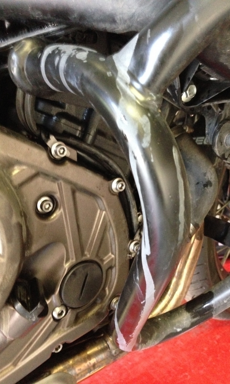 Obwohl ich die Sauerei binnen 1 Minute mit viel Wasser anspülte, glücklicherweise Tank und Seitenteile unversehrt blieben, hats den Sturzbügel härter erwicht