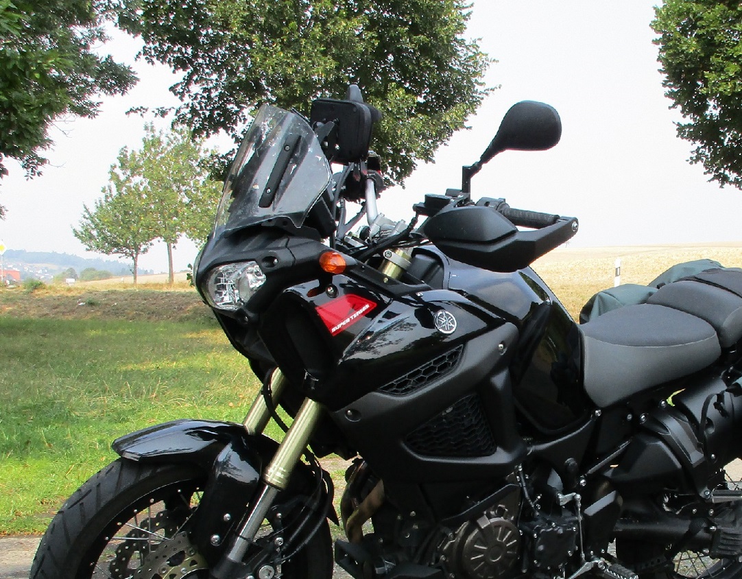 Hab' noch ein Foto gefunden von der XT mit der Navi-Tasche. Hab' sie an der TT-Scheibenbefestigung angebracht. So habe ich das Navi immer im Blick.