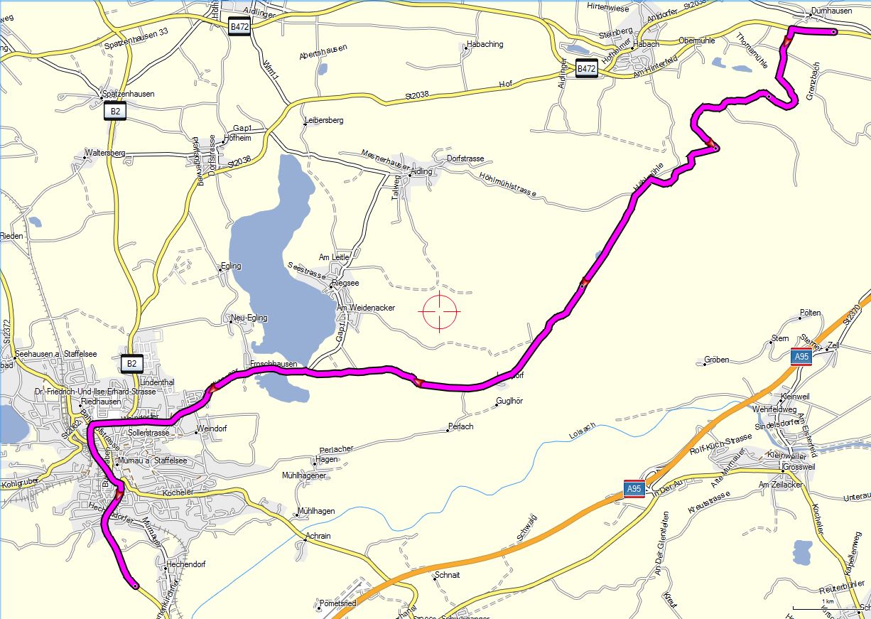 Na ja , wir sind ne kleine gemischte Truppe unterschiedlichster Fabrikate, die ab und zu mal gemeinsam ein Stück fahren. Haben mühevoll für kommendes Jahr paar Tage gemeinsam Urlaub erkämpft(vom Chef! unsere Frauen sind großzügig!) Wir meiden Autobahnen wie der Teufel das Weihwasser und lieben einsame kleine (möglichst befestigte) Straßen. Das bedeutet aber auch, das für uns 400 KM mit entsprechenden Fotohalten und Energiezufuhr für Mensch und Maschine tagesfüllend sind. Ab und zu mal eine Bundestraße fahren um überhaupt voran zu kommen bleibt nicht aus, aber zwischen drin bau ich mir gern mal so kleine Straßen ein wie auf den beiden Bildausschnitten.(Ist ja beides die gleiche Strecke, nur im 2. Bild bissel größer dargestellt.) Ist dann aber eben doof wenn auf der halben Strecke ein Schlagbaum oder so was den Spaß beendet.