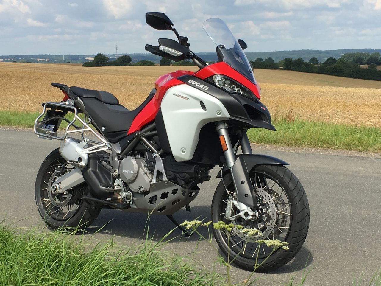 Momentanes Fazit: Die Multistrada Enduro ist ein Entdecker-Motorrad, das man vorher selbst entdecken kann. Kein Moped zum draufsitzen, und losfahren, immer interessant, immer bereit den Hammer rauszuholen. Wenn man den Motor startet, geht einem das Herz auf, auch während der Fahrt beim Gas wegnehmen. Das Display ist wirklich gut gemacht, sehr gut abzulesen, schaltet automatisch von hell auf dunkel um. Das LED-Licht ist sehr hell, das serienmäßige Kurvenlicht hat mich positiv überrascht, ich dachte nicht, dass man es brauchen kann, aber optimal, wenn in der Kurve liegend der Straßenrand sehr gut ausgeleuchtet wird. Leichtes Handling, trotz 30-Liter-Tank, sportlich zu fahren, wenn man sich auf das Motorrad eingestellt, und sich das Motorrad eingestellt hat. Das semiaktive Fahrwerk funzt wirklich gut, Werkseinstellung bissl weicher, kann man ändern. Beladungszustand ist mit einem Knopfdruck direkt anwähl- und einstellbar. Leerlauf findet man ducatitypisch im Stand sehr schwer, die Ducati-Getriebe müssen erst eingefahren werden - meine Erfahrung. Schaltung ab Werk aber hoch und runter butterweich, präzise, und kurz und knackig.