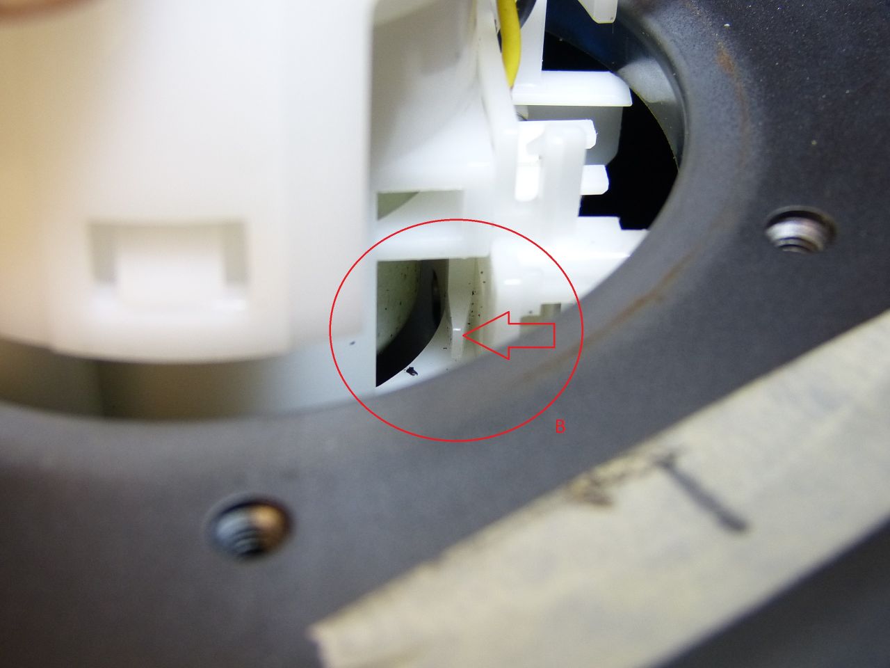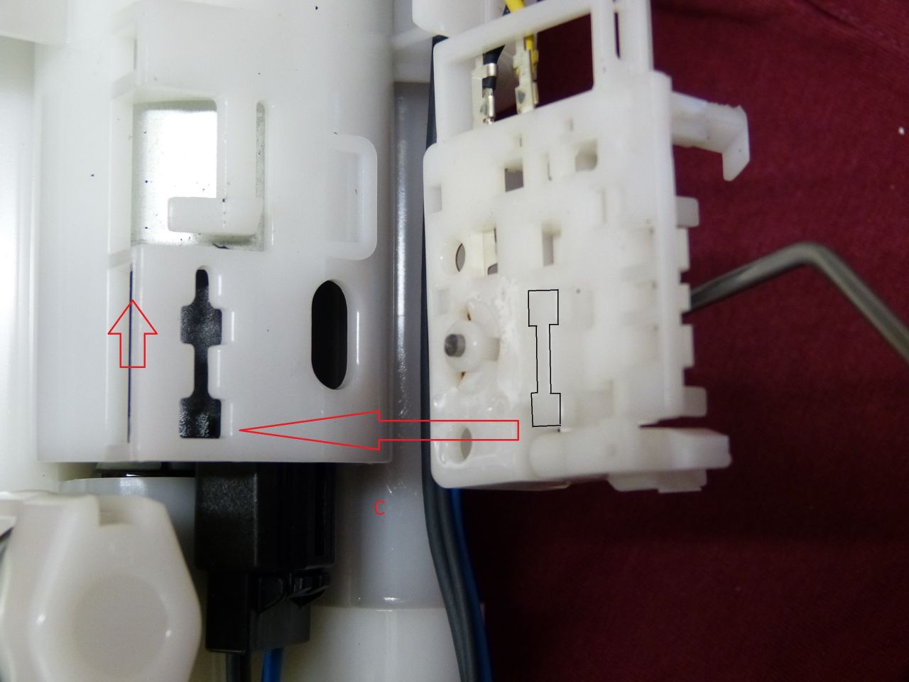 Im Detail A sieht man die Pumpe zum Teil aus dem Tank gezogen, jedoch bleibt der bewußte Plastikhaken an der Kante hängen. Im Detail B ist eine kleine Nase markiert, die mit einem Schraubendreher vorsichtig in Richtung Pumpe gedrückt werden kann. Wenn man dann das Schwimmerbauteil (Das ist der Teil mit dem Haken etc.) unter dem Tankrand anlegt, kann man die Pumpe vorsichtig hochziehen. Dabei rutscht das Schwimmerbauteil aus einer Schlüsselloch-Führung (Detail C) und hängt nur noch am Kabel. Den Stecker aus dem Pumpenteil abziehen. Dann kann die Pumpe und der Schwimmer separat aus dem Tank gezogen werden.