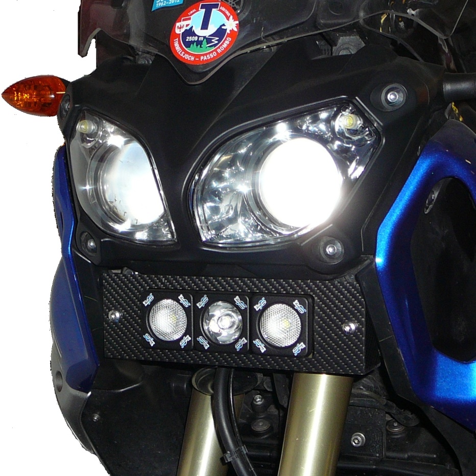 Ich hab mir, um besser sehen und gesehen werden, etwas vorgenommen: in der Mitte unter dem Hauptscheinwerfer ein Zusatzscheinwerfer mit TFL und dazu noch links und rechts einen Nebler. Der Scheinwerfer kommt noch etwas höher, so dass er dann mit dem Hauptscheinwerfer optisch zu einer Einheit wird. Auf dem Bild fehlt noch die Verkleidung um den Scheinwerfer.