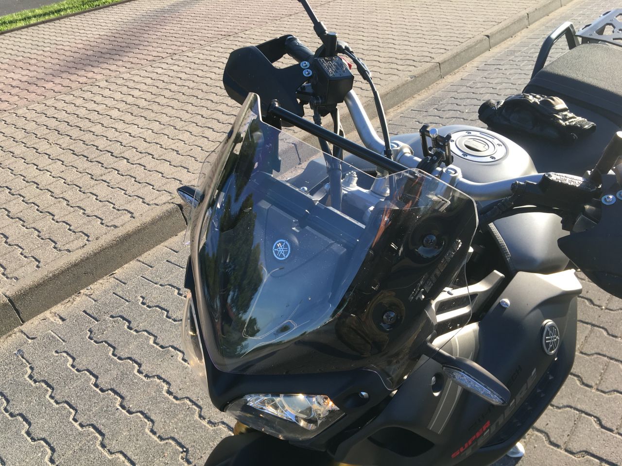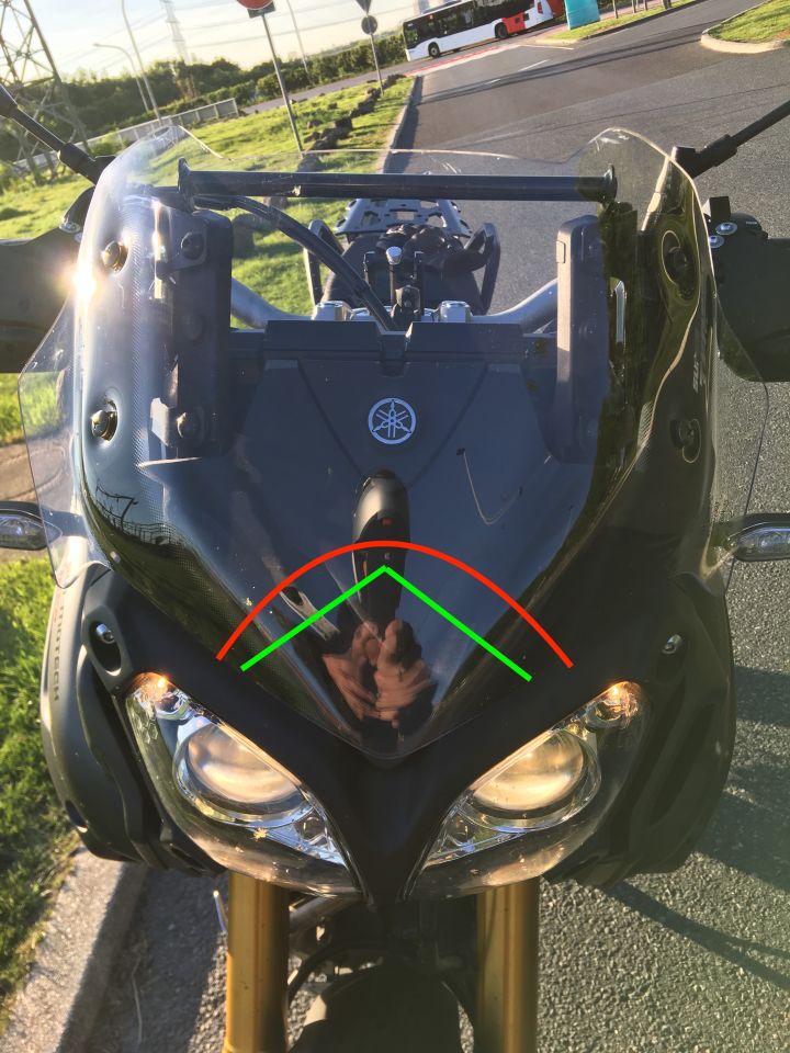 Von daher und weil ich eigentlich von der Nacked Bike Schiene komme, will ich herausfinden wie weit ich die original Scheibe kürzen muss, damit der Helm ohne Turbulenzen im Wind steht. Also wie wenn man sich bei fahren auf die Fussrasten stellt.