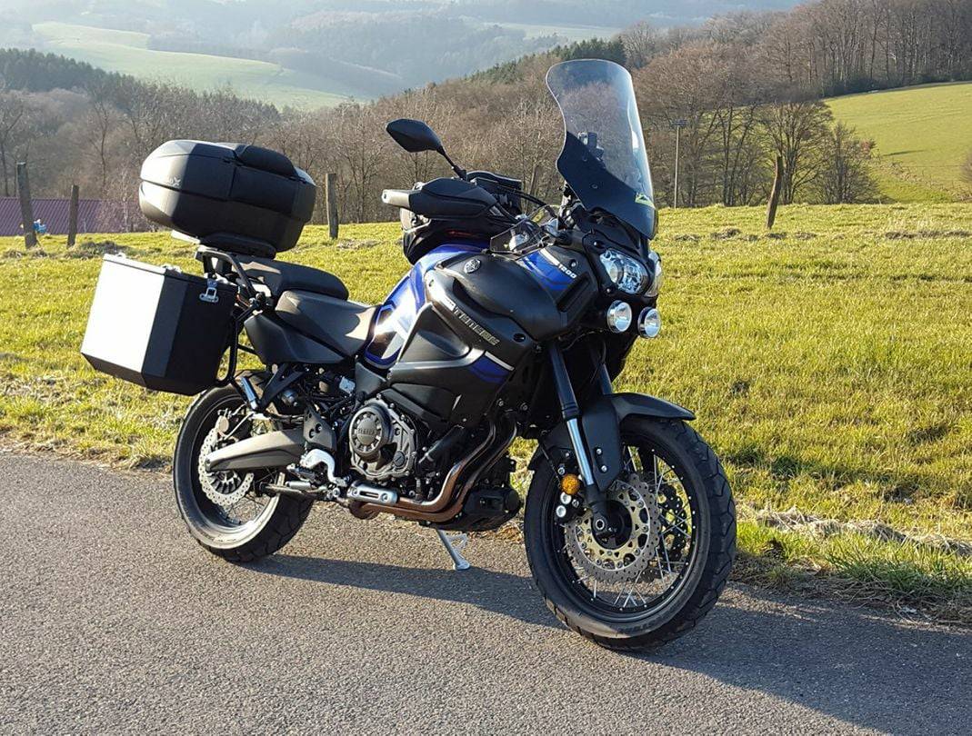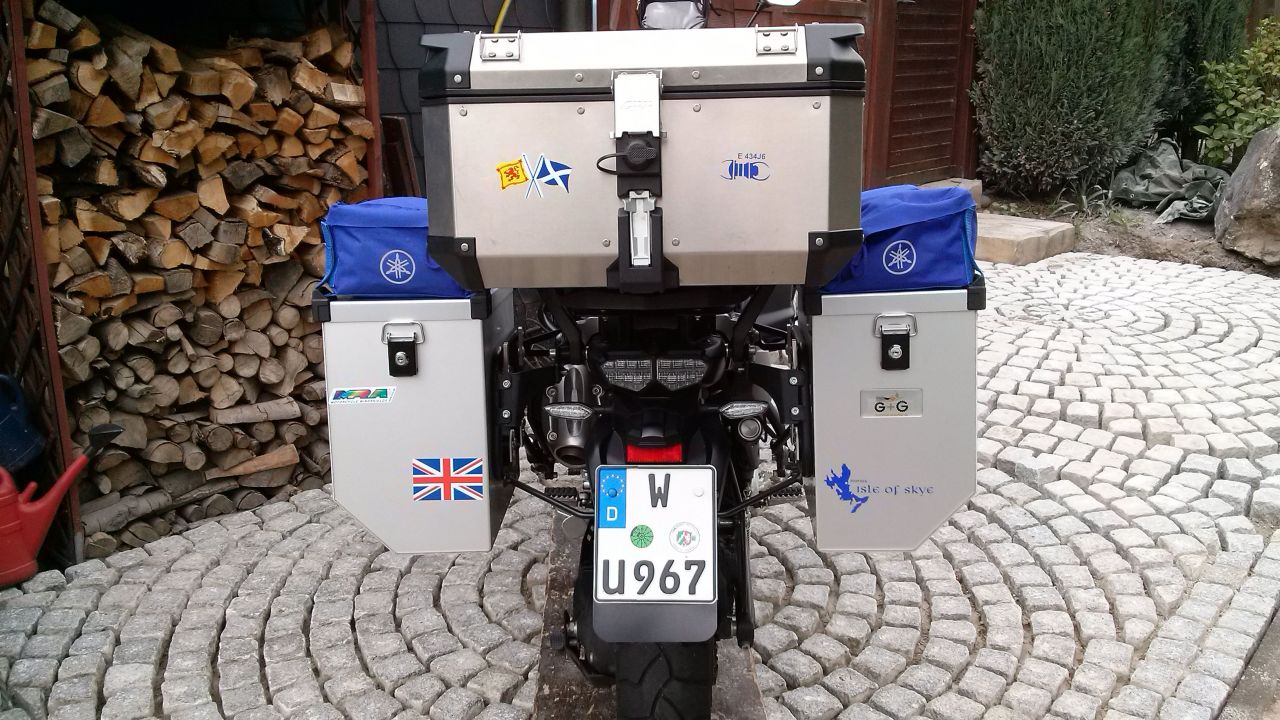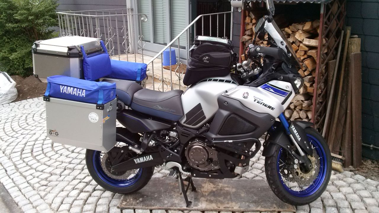 als stolzer Neu Besitzer einer Tenere möchte ich euch meine Gepäcklösung vorstellen. Montiert ist ein Hepco Becker Quicklock Träger damit die Koffer gleichmäßig abstehen. Das gefällt mir besser und ich kann gleich große Koffer fahren . Die Koffer sind von G+G aus Leverkusen und sind 36 Liter groß , halt finden die Koffer durch Schrauben im Inneren( ähnlichTT) , so sind die auch nicht zu klauen und trotzdem in 2 Minuten abzunehmen. Die Koffer sind absolut dicht kein Wasser oder Staub dringt da ein ( haben wir schon erprobt). Die Deckeltaschen sind selbst gefertigt mit versiegelten Nähten und auch im Regen und Schneefall dicht. Haben wir für die Regenkombis oder den Snack unterwegs uns ausgedacht. Das Topcase Givi Trekker Outback in der großen Variante, warum Givi da haben wir schon mit den Kunstofftopcases gute Erfahrungen gemacht. Die Deckelinnentasche ist für Dokumente gedacht welche man unterwegs nicht so dringend braucht. Der Tankrucksack ist auch ein Hepco Becker der über einen Tankring hält. Hier ist die schwarze Regenhaube echt doof, den dann ist das Kartenfach Blind, doch er hat sehr viel Platz. Was schon in Planung ist, eine Deckel Tasche für das Topase. Auch in do it youself.