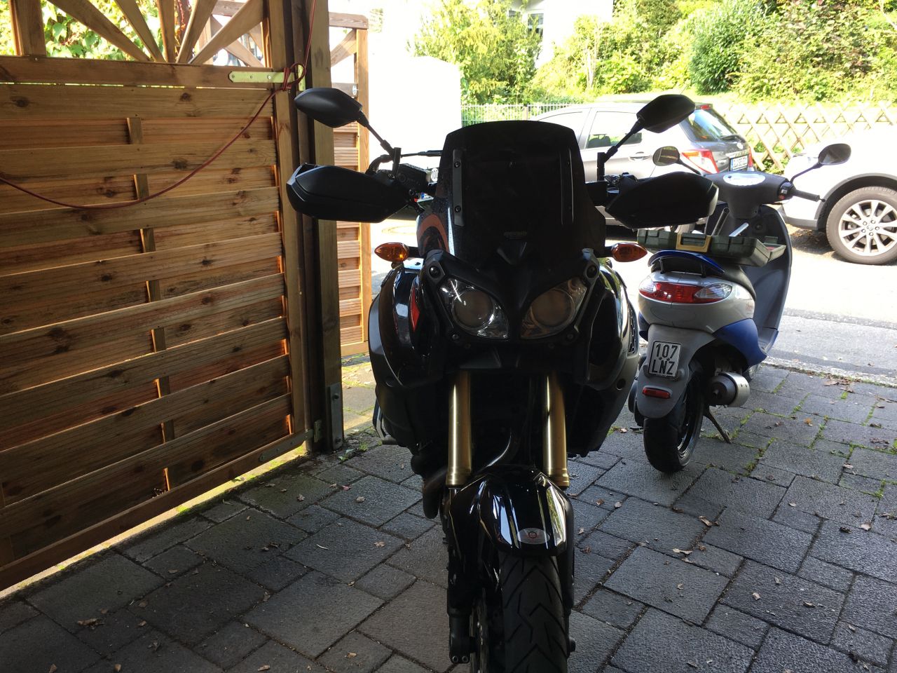 Kurzzeitig wurde auch der "Gepäckträger" gegen eine Otterbox getauscht. Eigentlich eine schöne Sache aber das ohnehin nicht schöne Heck wurde damit optisch noch mal kürzer. Dieser Umbau war dann von genauso kurzer Dauer. Scheiben waren auch lange Zeit ein Thema. Die originale ging so aber mein Helm hat immer gepfiffen. Also im Marktplatz eine hohe Zubehörscheibe geschossen. Ein paar Tage gefahren und als untauglich für mich befunden.