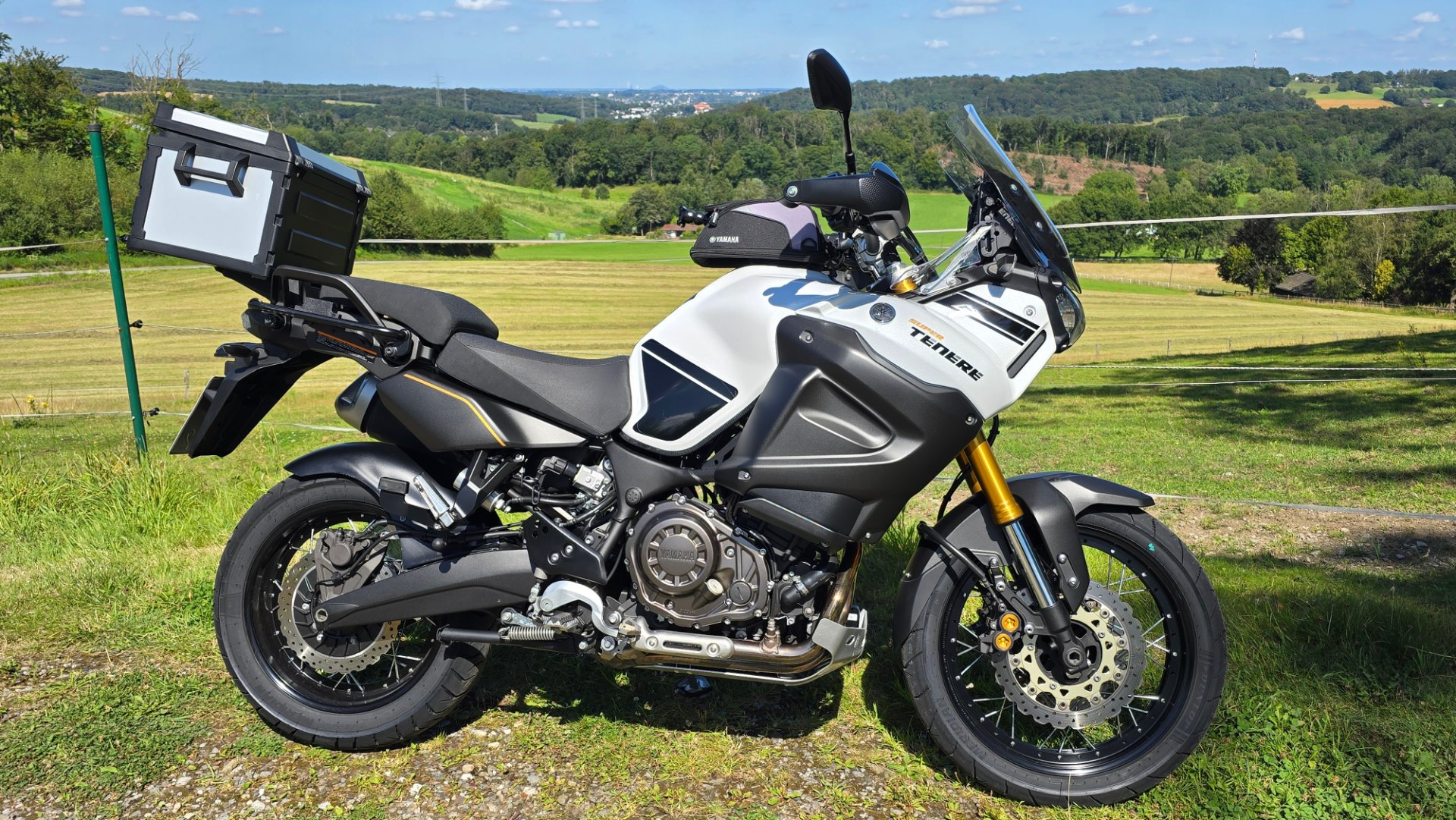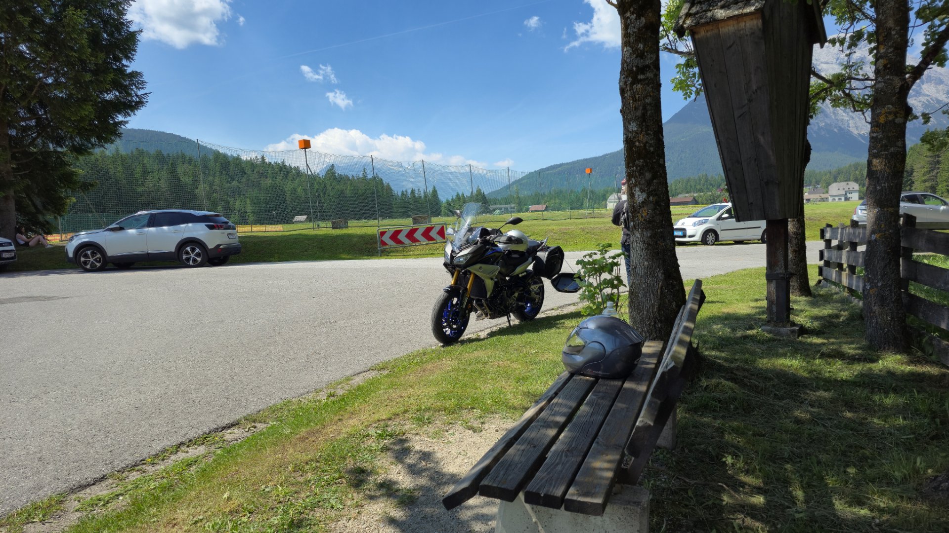 Gestern mit meiner Tracer 900 GT, in der Nähe von Leutasch, vor einer Bank geparkt. Beim besten Wetter.