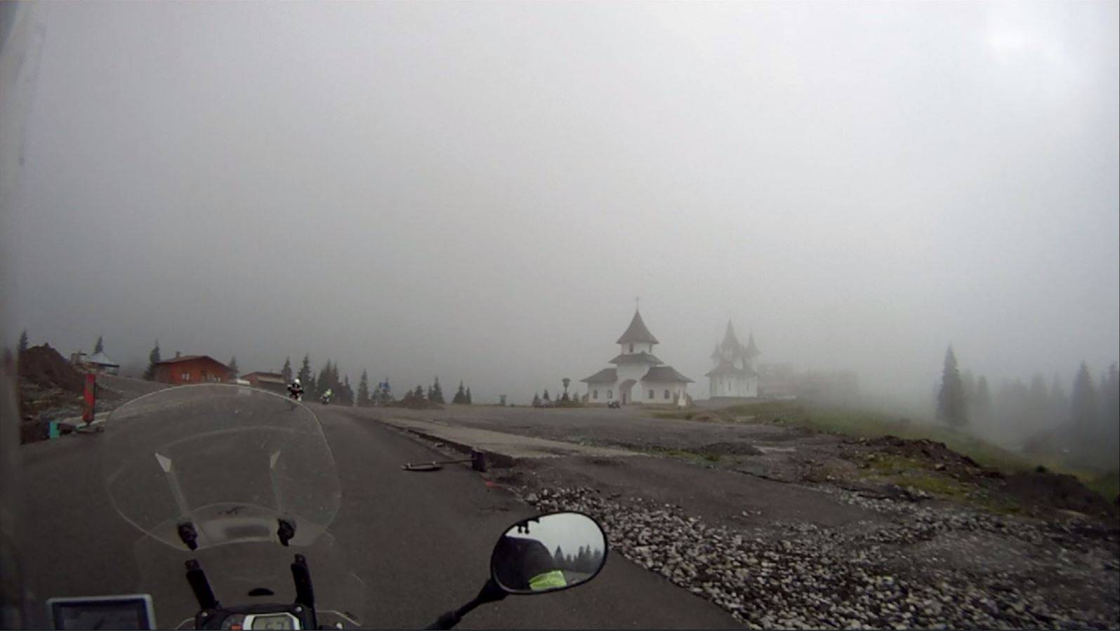 Jetzt begann der Prisloppass mit seinen 1416m Höhe. Der komplette Pass war eine Baustelle. Geteert war er bereits, aber die Randsteine waren noch nicht gesetzt. Die Geschwindigkeitsbeschränkungen wechselten ständig von 30 über 40 bis 60km/h. Irgendwann haben wir den Überblick verloren und sind den Pass in Normalgeschwindigkeit, angepasst an die nassen Bedingungen, gefahren. Verkehr fand auf der Straße so gut wie nicht statt. Auf dem Weg zur Passhöhe konnte man schon erahnen, dass es bald zu regnen beginnen wird. Auf der Passhöhe war es neblig und die Temperatur lag bei 10. Grad.