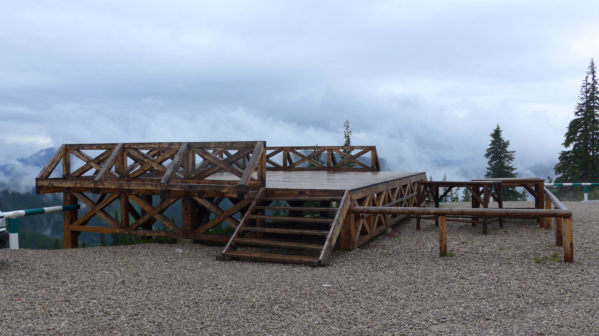 Auf der Passhöhe war ein Schotterparkplatz angelegt und es existierte ein Holzplattform, von der man eine schöne 180 Grad Blick auf die Berge hatte.