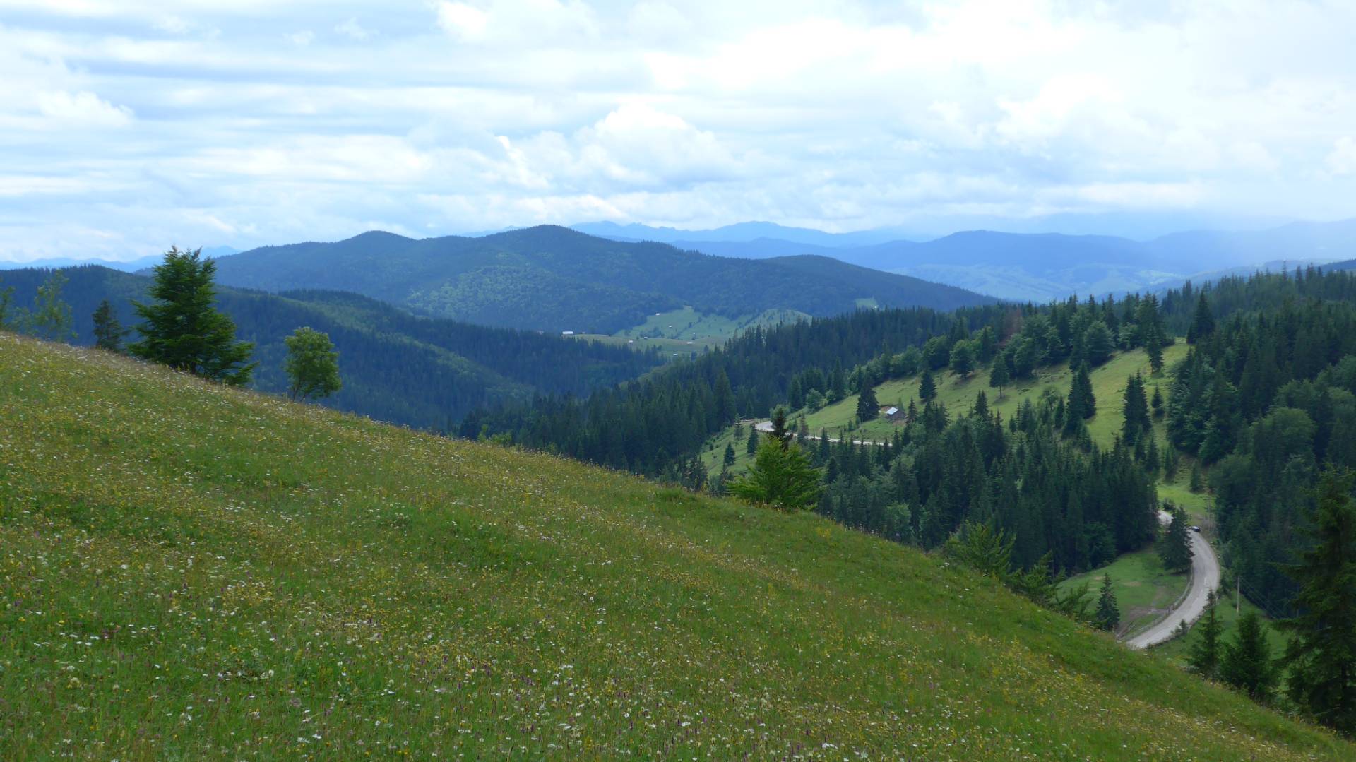 Jetzt stand aber erst einmal der Curmatura Boului Pass auf dem Programm. Sozusagen ein rumänischer Kurzstreckenpass, denn bereits nach 13km waren wir drüber. Weiter ging es entlang der DN17A zum Ciumarna Pass. Die schöne kurvenreiche Auffahrt machte mächtig Spaß. Oben am Pass angekommen wurde wieder eine kleine Pause, der schönen Aussicht wegen, eingelegt. Hatten wir bei der Auffahrt einen Bus überholt, kam dieser nun hier an und spuckte seine Fahrgäste aus, ein Heer von polnischen Touristen. Zunächst genossen auch diese die Aussicht bis eine Blondine so um die 30 Jahre uns Motorradfahrer entdeckt. Sie kam sofort zu uns rüber, schmiss sich Markus an den Hals und ließ das schön von Ihrer Freundin ablichten. Dann war ich dran. Sie warf sich so stark mit dem Rücken gegen mich, dass ich fast mit dem Moped umgefallen wäre. Ihre Freundin knipste was das Zeug hielt. Klaus und Markus starteten die Motoren, das war auch für Blondchen das Zeichen einen Schritt abzurücken. Sie war hübsch, ich hätte sie mitgenommen.