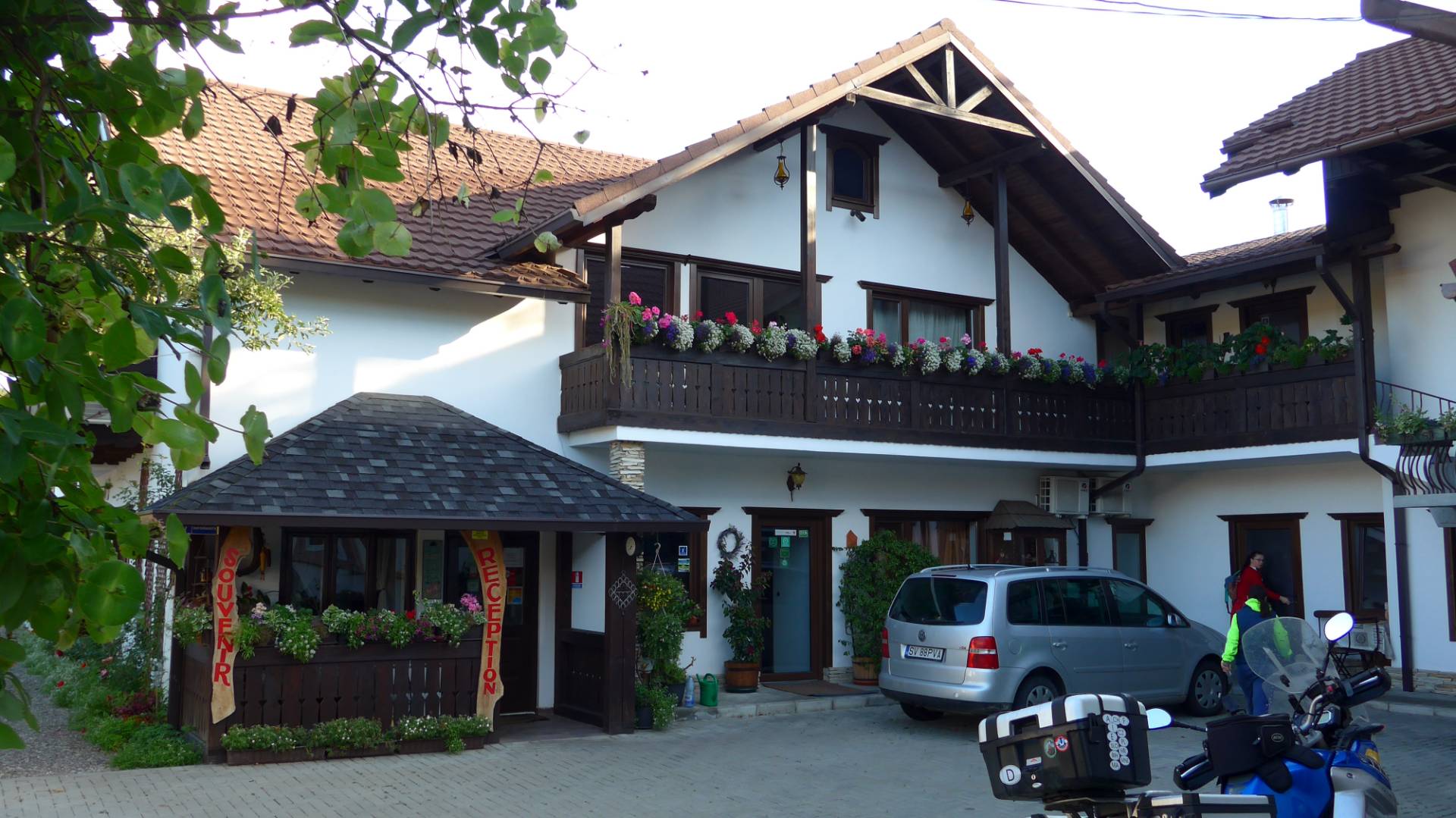 Das nächste Highlight wäre das Kloster Sucevita gewesen. Da es aber vollkommen eingerüstet war, fuhren wir daran vorbei. Die letzten 50km zum Hotel waren geprägt von unendlichen Ortsdruchfahrten und viele lange Geraden. Die Straßen waren trocken und die Sonne kam heraus. Hilde's Residence, so der Name unserer Unterkunft, war wieder ein Volltreffer. Große Zimmer, modern ausgestattet und ein schönes Bad verhalfen zu einem entspannten Aufenthalt. Die Mopeds parkten sicher vor der Rezeption. Beim Abendessen lief Fußball, irgend so ein unwichtiges WM-Spiel. In der Halbzeitpause kamen Nachrichten und jetzt wurde uns klar was in dieser Region in den letzten Tagen los war. Seit Mitte Juni gingen in der von uns befahrener Region sinnflutartige Regenfälle nieder. 182 Häuser stürzten ein, 6.979 Wohnhäuser wurden überschwemmt. 23 Menschen kam uns leben. Der Schaden wird auf 400 Millionen EUR geschätzt. So gesehen, hatten wir richtig Glück, dass wir einige Tage nach den Unwettern die Region durchquerten.