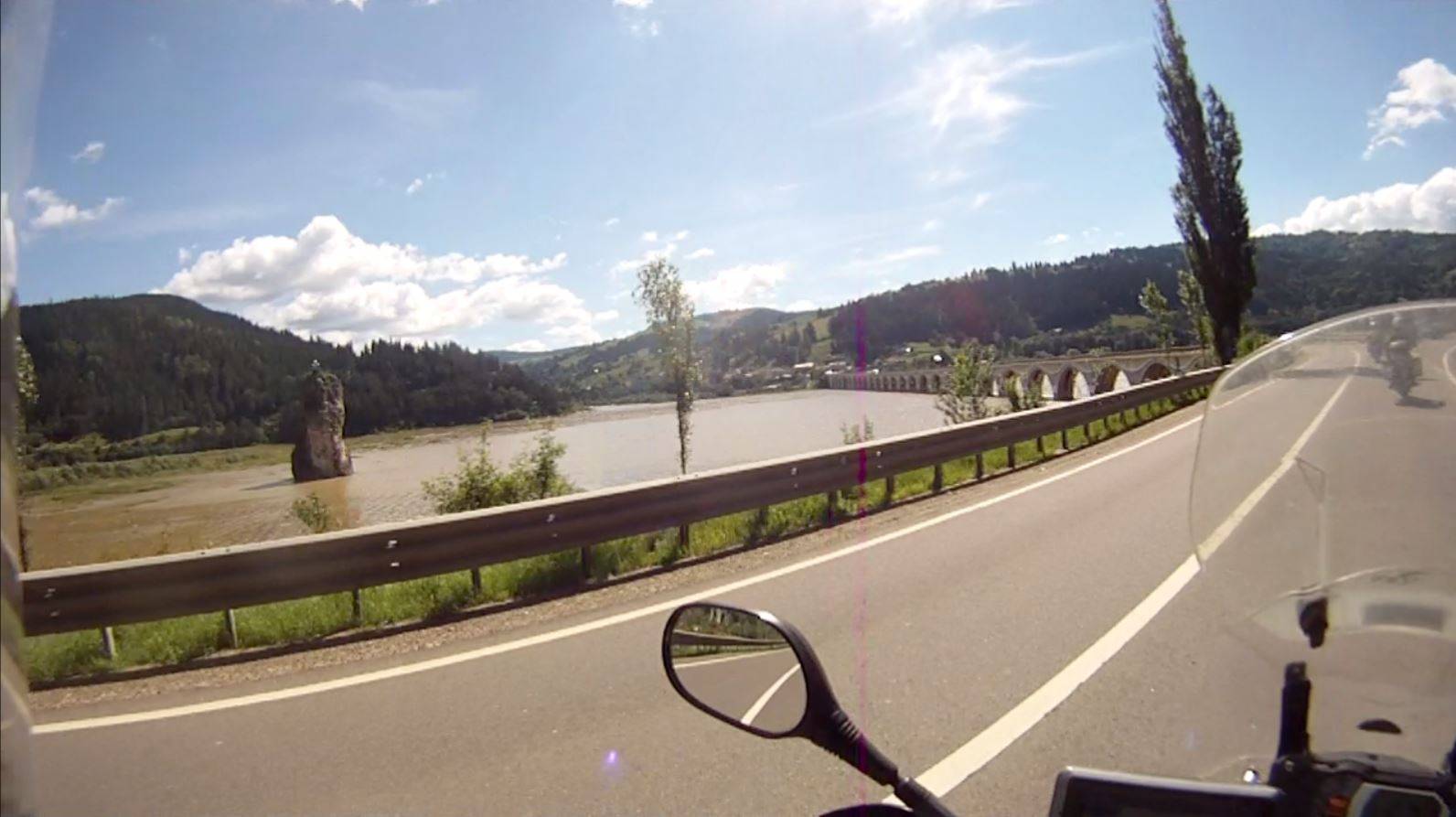 Die DN17B hatte zwei Gesichter. Zum einen gab es neu asphaltierte Streckenabschnitte und meist in den Ortschaften, die sich häuften, Betonplatten mit Teerflecken. Nach 37km erreichten wir die Brücke über das Nordende des Bicaz Stausees, an dem wir 37km entlang fuhren. Unter der Staumauer machten wir die nächste Pause. Nach Bizac waren es noch 3km. Dort wir bogen nach rechts auf die DN12C ab, um zur Bizac Klamm zu gelangen.