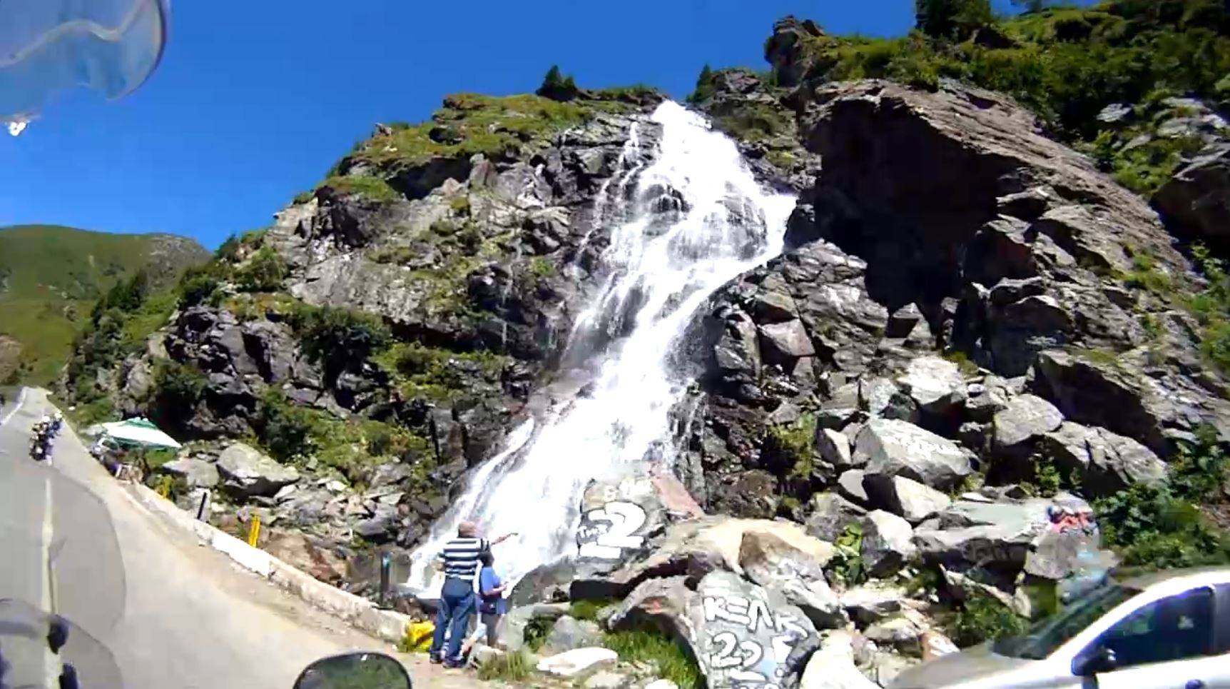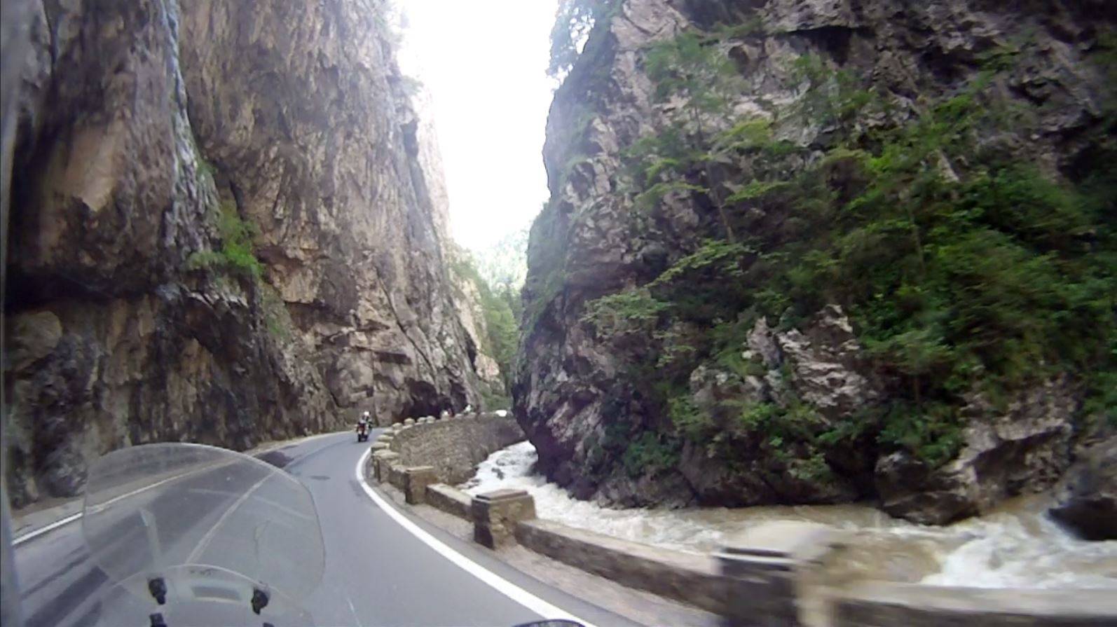Am Dracula Schloss hielten wir kurz für zwei Fotos und überließen das Schloss den vielen Bustouristen. Weiter ging es Richtung Giuvala Pass. Kurz vor Ortsende des letzten Dorfes sprang der Tacho meiner XT auf 150.000km. Das musste fotografisch festgehalten werden. Die Auffahrt zum Pass war auf den ersten Kilometer richtige spaßig bis wir auf drei Betonmischer aufliefen. Wir hatte bereits zwei überholt, als der Dritte rechts abbog und die anderen auch. Zügig überquerten wir den Pass und bogen danach nach rechts in die Wasserschlucht ab. Der Lieferwagen vor uns ließ noch schnell einen LKW abbiegen. Der LKW machte sich breit, nahm die gesamte Straßenbreite für sich in Anspruch und wollte sich nicht überholen lassen. Trotzdem kamen wir vorbei und der Fahrer bekam von mir noch einen Finger mit auf den Weg. Die Wasserschlucht fuhren wir einmal hoch und wieder runter, wir trafen auch den LKW wieder, er bekam erneut einen Finger und wir fuhren zurück auf die DN73.