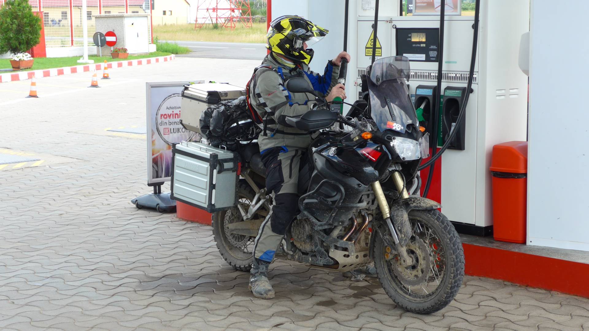 In Niklasmarkt wollten wir einen Kaffee einwerfen. Eine Bar oder eine Café haben wir leider nicht gesehen. Am Ortsausgang befand sich eine große Lukoil-Tankstelle mit kleinem Laden. Dort gab es den ersehnten Kaffee. Kaum hatten wir den Kaffee in der Hand, kam eine weitere XT 1200 zur Tankstelle. Der Fahrer eingesaut mit Lehm, das Moped viel dreckiger als unsere. Nach und nach trafen 3 weitere Motorräder ein. Die Gruppe war Offroad fahren. Der XT-Fahrer, ein Slowake, zeigt uns Handyfotos. Diese Schlammwege würde ich mit einer XT niemals fahren.