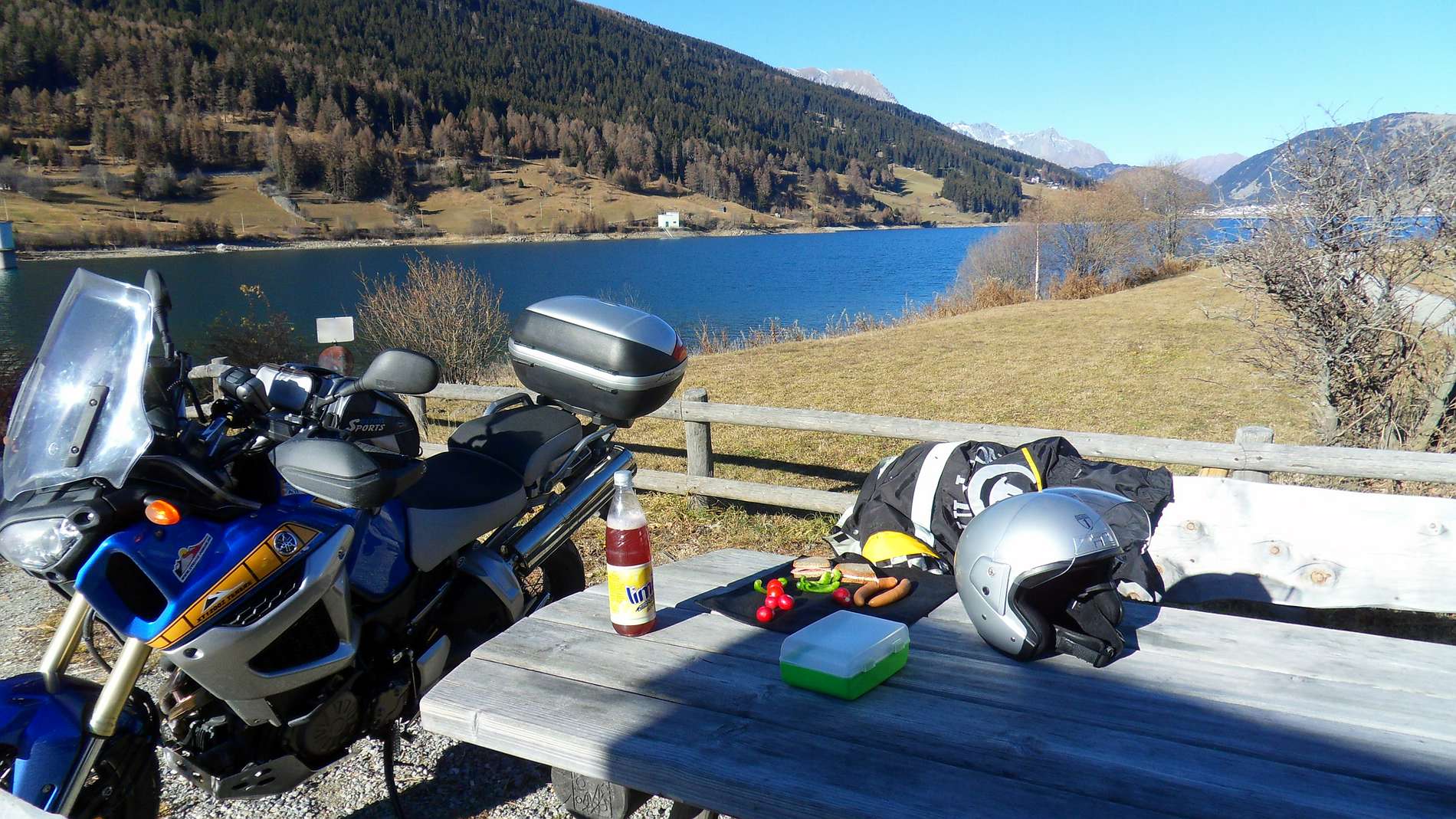 Beim Frühstücken aus dem Fenster geschaut und gedacht. Ne bei dem Wetter kannste nicht zu hause bleiben. Also einen Sack Brotzeit bestellt das Navi auf Stilvserjoch eingestellt rin in die Klamotten und weg. Das schöne Wetter taüscht doch höhere Temperaturen vor als sie sind. Bis nach Tarrenz doch immer so um o° rum. Aber der Reihe nach. Straßen alle Feucht ein zeichen von Gesalzen. Richtung Garmisch nach Ehrwald und den Fernpaß rauf ein Bus vor mit der eine gewaltige Staub Fontäne nach sich zog es war aber SALZ das er aufwirbelte so was hab ich auch schon lange nicht mehr gesehen. Aber die Ösis sind an dem Paß doch sehr besorgt um ihre Fahrer. In den Kurven merkt man das Geschmiere doch ab und zu wens zu flott dahin geht. Besonders wenn eine trockene Kurve im Schatten und feuchter Fahrbahn endet. Und immer noch lausige Temperaturen da ist man um jeden Tunnel froh der kommt dort gehen die Grade doch schon bis 8° hoch. Nach dem Nasserreiter Tunnel getankt ein Zigarettle geraucht und weiter gings nach Imst auf die Inntal Autobahn bis zur Abzweigung in den Landecker Tunnel mit fast 7 km länge der längste in Österreich . Es wurde richtig wärm drin so 13° gegen 2° drausen sind schon -sommerhaft na gut 7km lang aufgewärmt. gins weiter am Kaunertaler gletscher vorbei und auch Samnaun ( dort gibts Steuer freien Sprit und sonstige Waren ) blieb diesmal verschont von mir. Und schon beginnt die Auffahrt zum Reschen auch hier gut Gesalzen. Nochn Bild bei der Festung Nauders und einige Kurven weiter Sonne Pur und 10° keine Wolken und strahlende Blauer Himmel wie auf Postkarten. Über Nauders nach Italien und schon ist er da der See sogar mit relativ viel Wasser das bei der Trockenheit schon verwundert. Bisschen geknipst und weiter zur Stau Mauer auf meinen Stamm Rastplatz. Nach der Brotzeit weiter richtung Stelvio Bei Males Venosta gehts rechts weg über den Tauferspass in die Schweiz nach langem wieder mal Grenz- Posten gesehen der Italiener schaute auf Nummern schild und winkte mich durch der Schweizer fragte gleich wos hin gehen soll ( ich war wohl der einzige seit Tagen ) Ich wollte über den Umbreil zum Stelvio und zurück nach Nauders. Aber beide Geschlossen bei dem Wetter hätte man doch mal Raümen können meinte auch der Zöllner na was solls noch n bisschen in der Schweiz rungekurvt und dann zurück übern Reschen in den Landecker Tunnel bei Sommerlichen 16° und das 7 km lang super. Übern Fernpaß nach Ehrwald noch mal getankt und über Garmisch nach hause es wurde immer wärmer bis 15° und so konnte ich es noch mal fliegen lassen. Am Montag dann mein Salz Ei Gewaschen und mit heisem Wasser abgestrahlt und jetzt steht se wieder da und wartet auf den nächsten Ausritt. Mit Abstechern 470km.