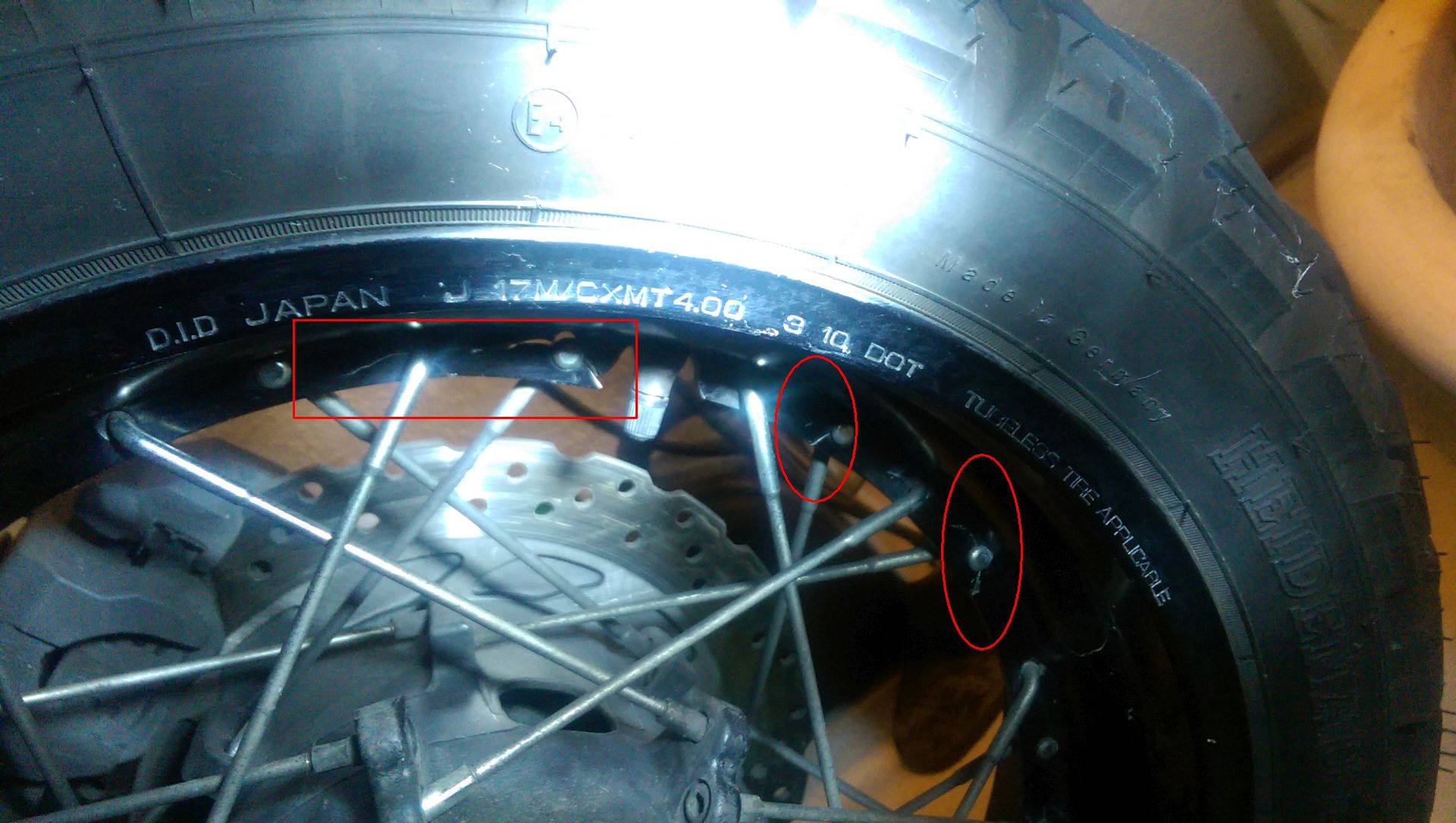 Falls wir noch ein Foto aus dem V-Strom-Forum bekommen sollten und die Beschriftung gleich wäre (weiß jemand, was es mit dem "3 10 DOT" auf sich hat - Herstellungsdatum?), würde ich in der Situation nicht lange fackeln und die Suzuki-Felge einspeichen lassen. Das mit dem Schlauch wäre mir "suspekter" als eine baugleiche Felge.