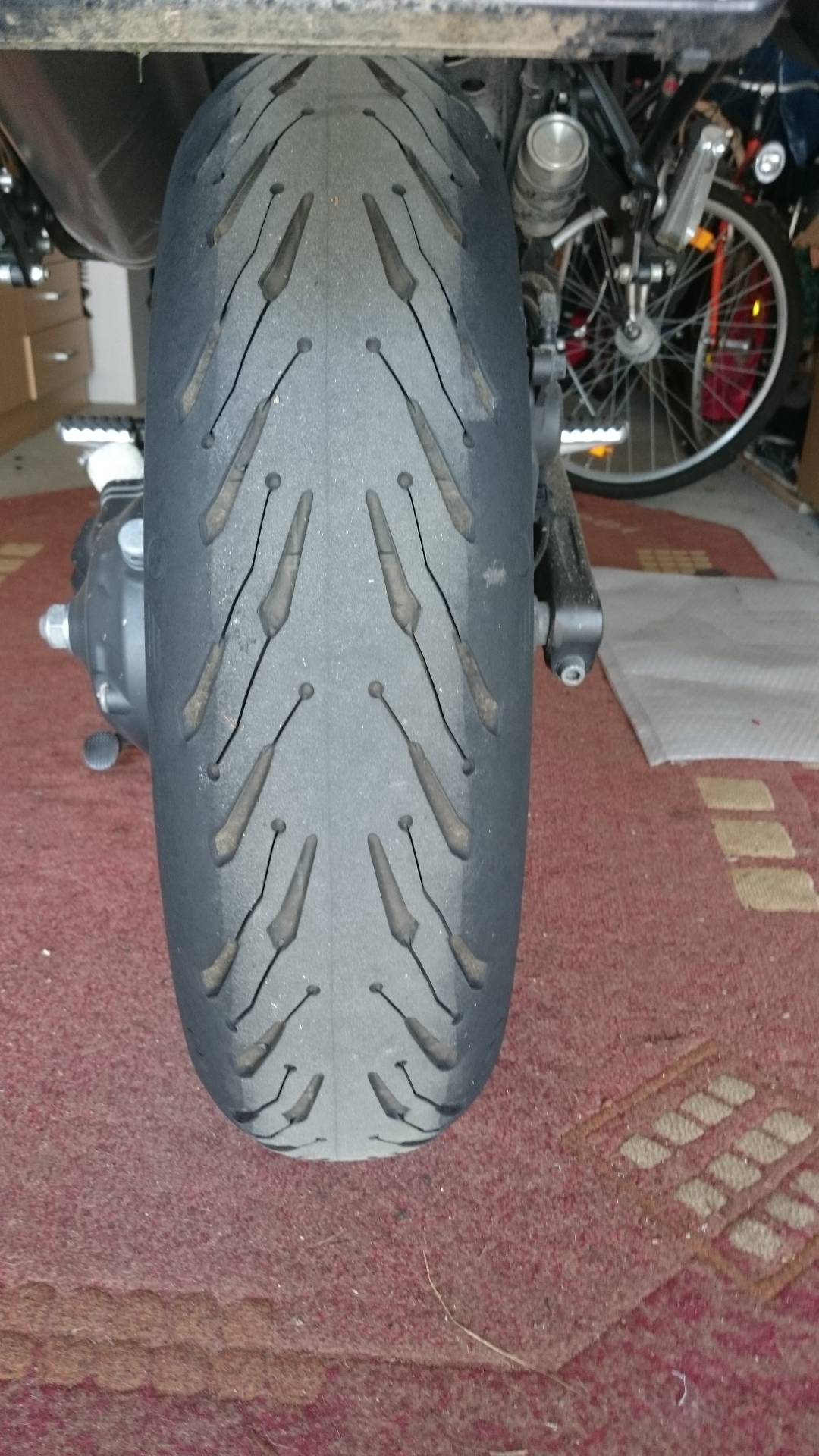 Der Gesamteindruck der Reifen ist auch nach etwas über 5000km Top. Gleiches Bild wie eins höher, halt mit etwas weniger Profiltiefe.