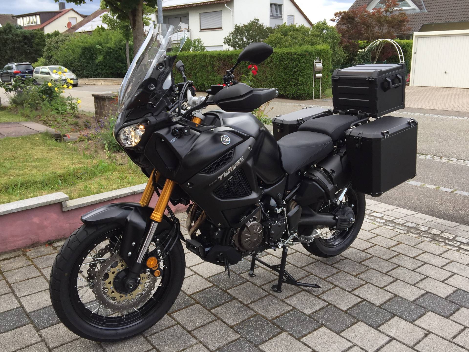 Meine Entscheidung fiel auf ein für die Tenere passendes Komplettangebot bestehend aus Träger und zwei Koffer. Der Träger liegt auf der linken Seite eng am Motorrad an, wodurch der linke Koffer einen kleinen Ausschnitt und somit etwas weniger Volumen hat. Ich entschied mich bei den angebotenen Größen 31 l, 38 l und 45 l, für die mittlere Größe.